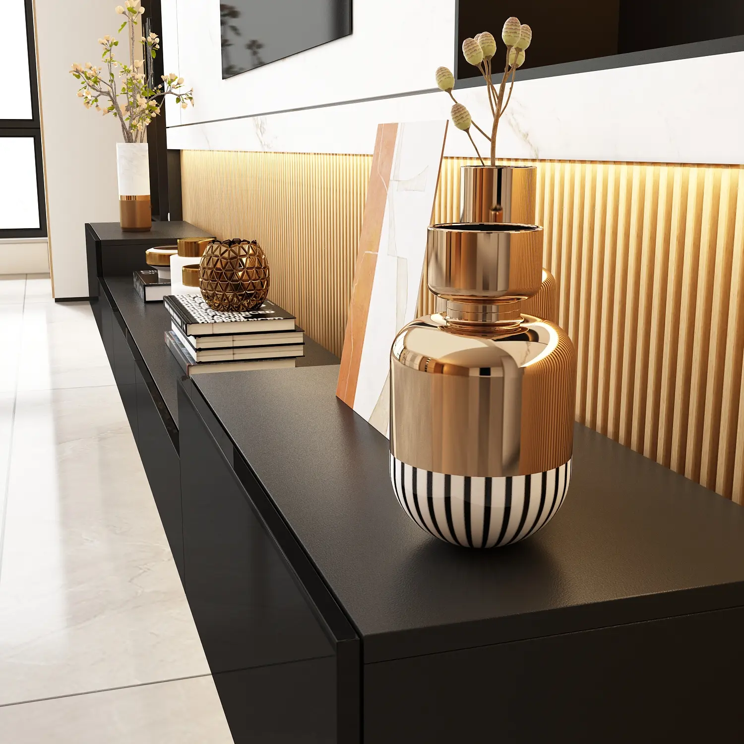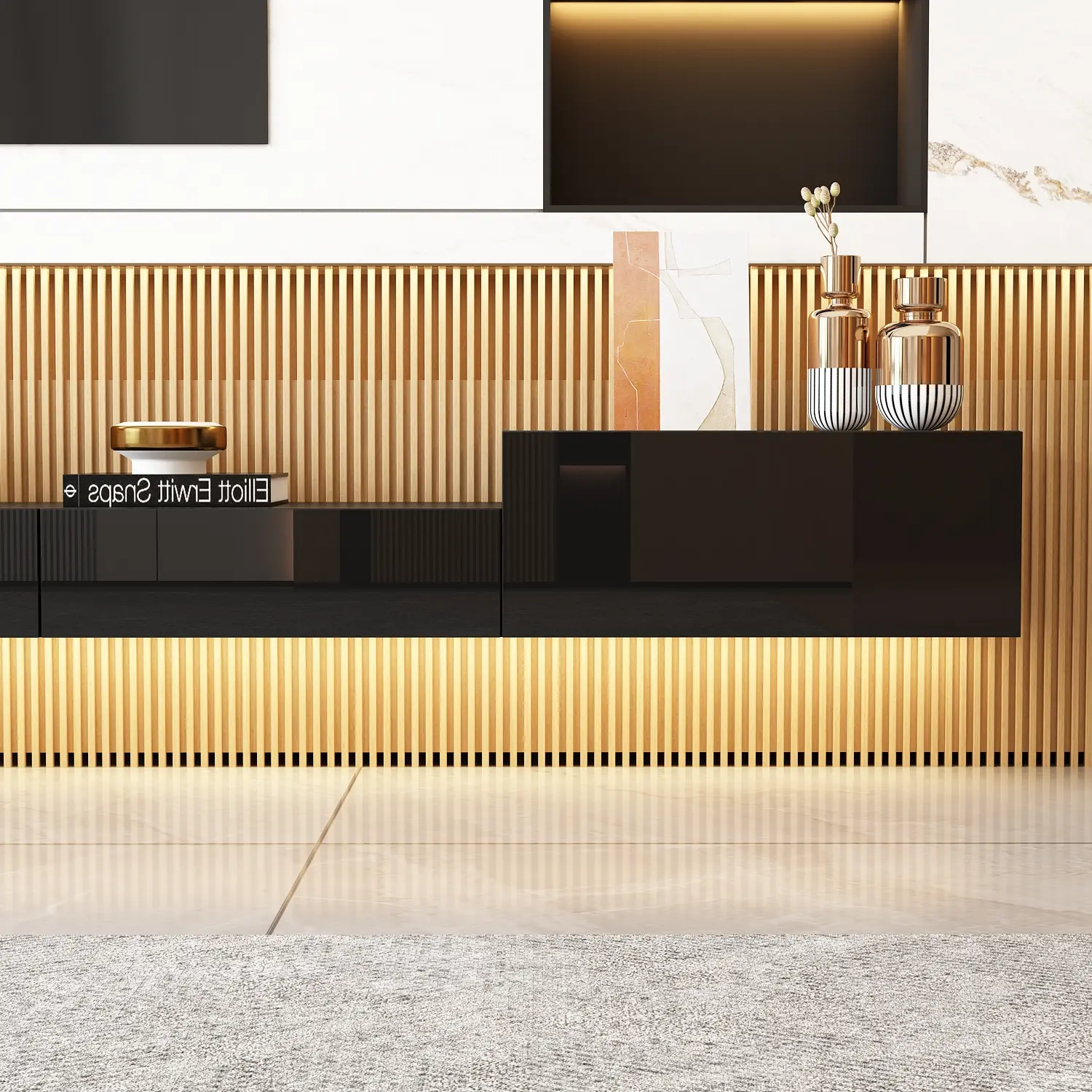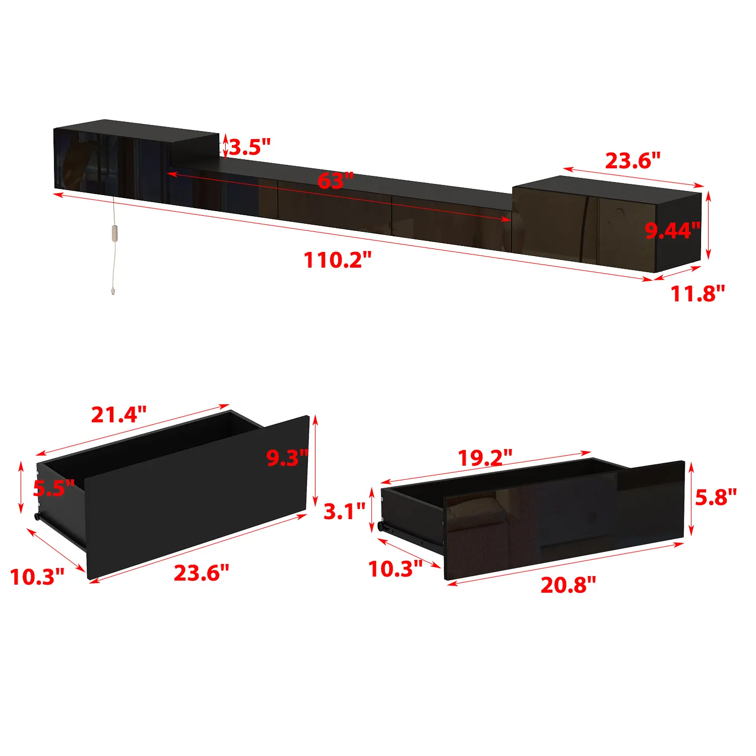 ·Modern & Fashion - Compact appearance and pure black color gives a timeless look for your living space. The high gloss drawer fronts add a modern touch to this TV console and the straight lines show simplicity. Attention: This media console can only be fixed to concrete wall.