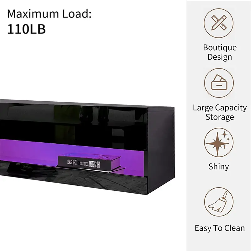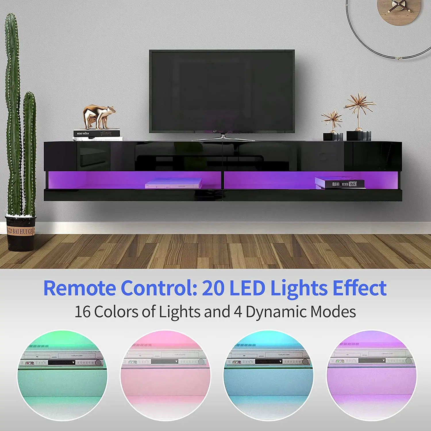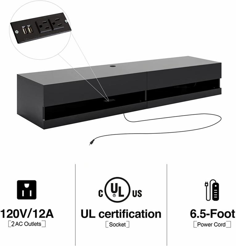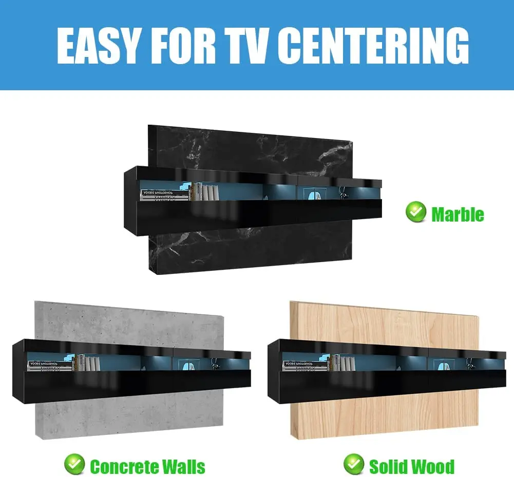 4. Adjustable LED Light System: The floating TV stand with 20-color RGB LED lights can be adjusted remotely and arbitrarily, bringing you a different visual experience and room fun.
