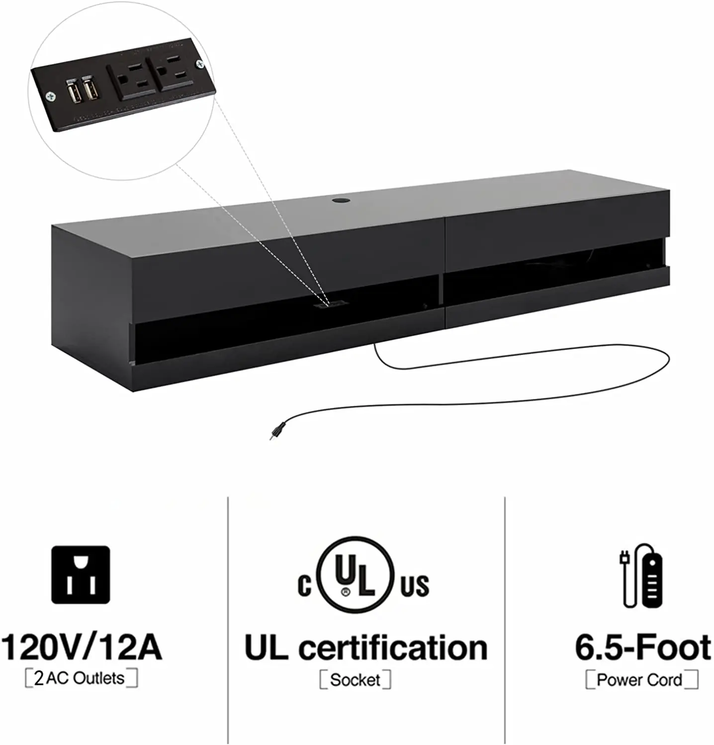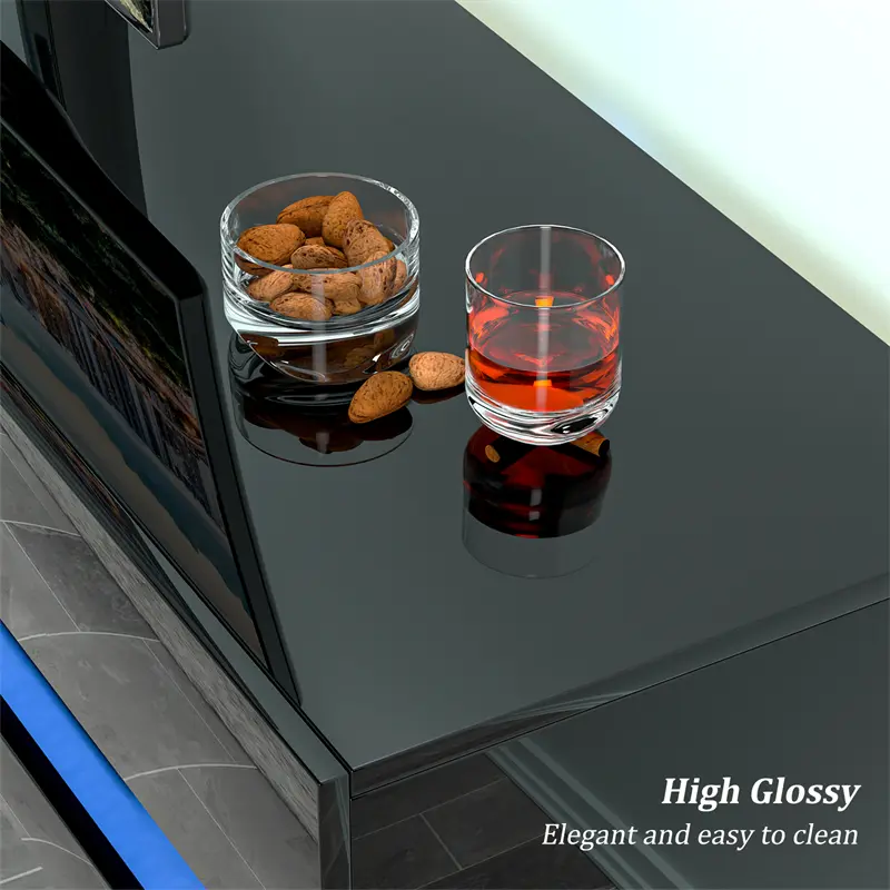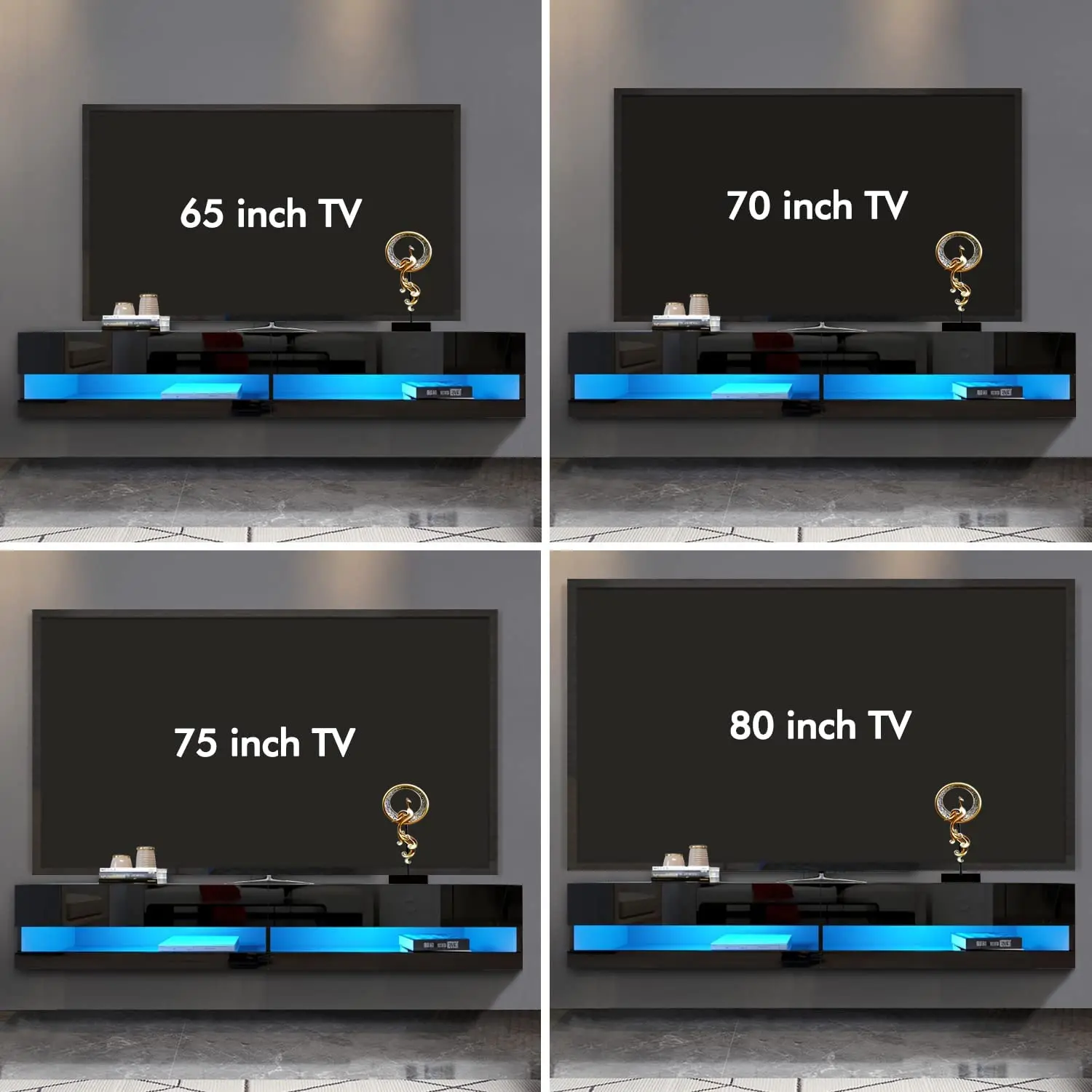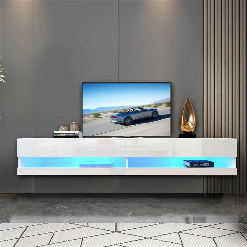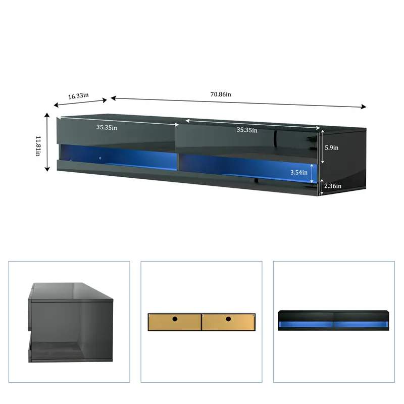 3. High Quality Material: Made of solid particle board material with glossy paint process, this LED floating TV stand has neat lines and hard appearance. Fit up to 80 inch TV Screen, dimensions is W 70.9" D 16.5" H 11.8".