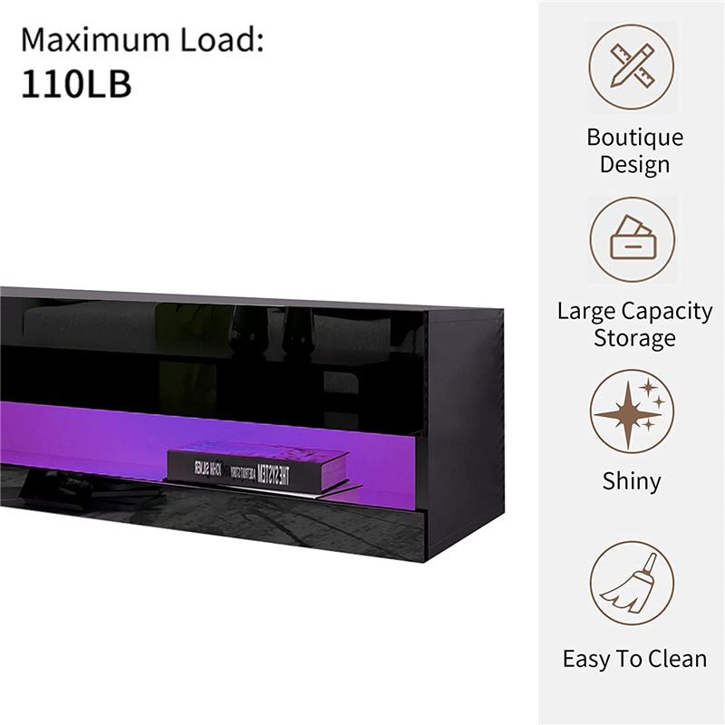 1. Modern and Minimalism Floating Cabinet: This floating TV stand wall mounted features an RGB LED lights system for up to 80 inch + TV, not only saving a lot of space but also looks modern and luxurious. The floating entertainment center will add a touch of classiness and vitality to your bedroom, living room, media room, etc.