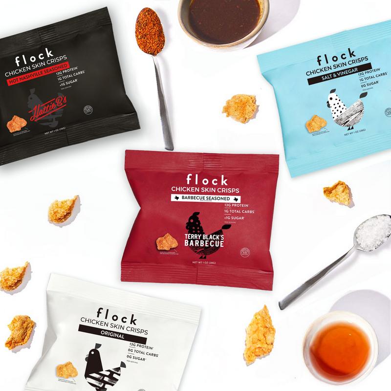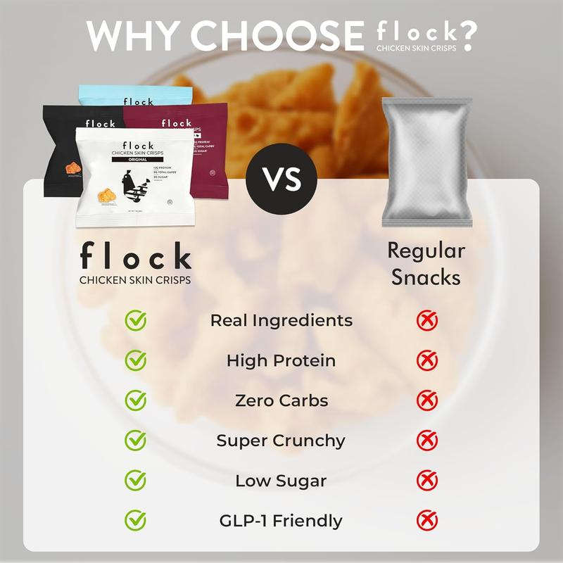 Can’t pick just one? Try them all. The Flock Variety Pack brings together our top four flavors of crispy, high-protein chicken skin snacks — all made from 100% real chicken skins, fried to golden perfection, and seasoned for pure crunchy satisfaction.