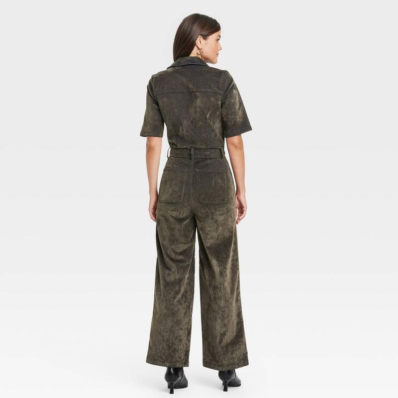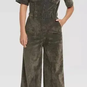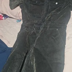 I was hesitant to order this denim jumpsuit, but I'm glad I did. It has a soft, velvety feel to it. The fabric is on a thicker side, but I prefer it that way. On the pictures it will look a little bit more of a gray than green, but it is definitely darker green in person. Shipping was very fast.