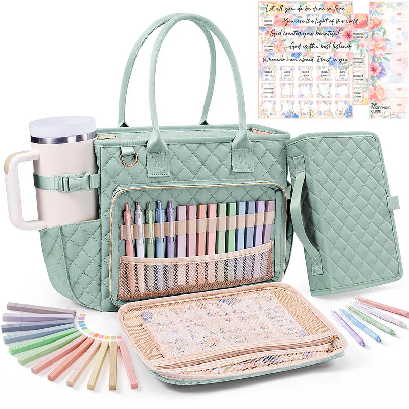 Super cute tote bag. Big enough for all my stationary, books, notebook, bible, tablet, pens and highlighters. Appreciate the accessories that the bag came with.