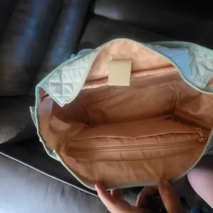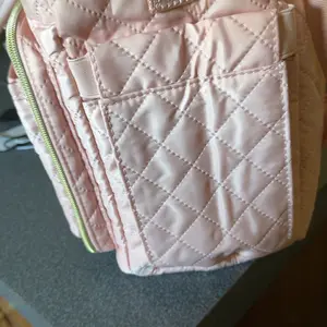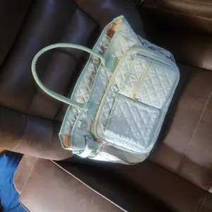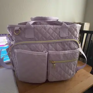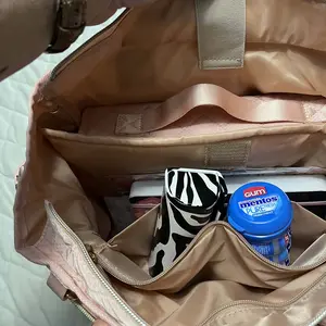 I can already tell this is gonna be become my new favorite bag to take to church. The material feels like it’ll wipe off really easy and has the bag has a zipper and handles and strap to put it over your shoulder.
