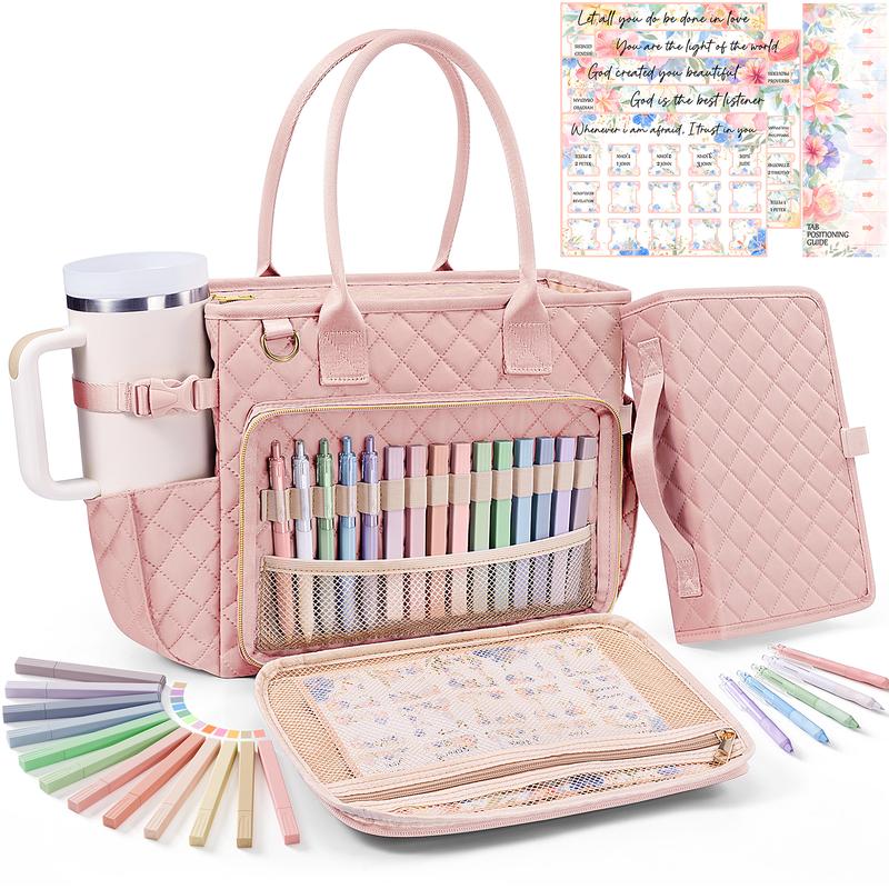 Loving this roomy Bible Tote Bag, with shoulder Strap, Bible cover with ribbon bookmarks, 5 gel pens, 12 highlighters, 75 Bible tabs, tab position guide. It can hold 40oz cup/tumbler. I put my wallet in here this am for church, didn’t have to carry a purse. Love this bag !!