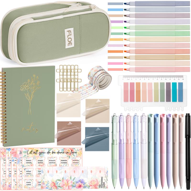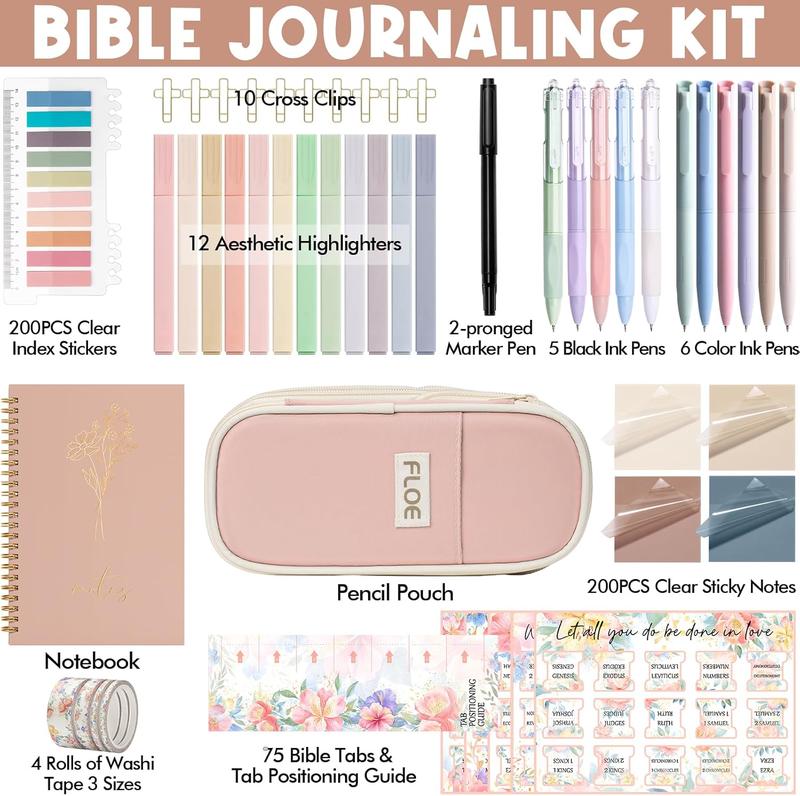 - This kit includes a pencil case, 12 Bible highlighters, 6 color gel pens, 5 black gel pens, 1 double-ended marker, 75 Bible tabs with a positioning guide, 4 color transparent sticky notes, 200pcs sticky index tabs and an aesthetic spiral A5 notebook.