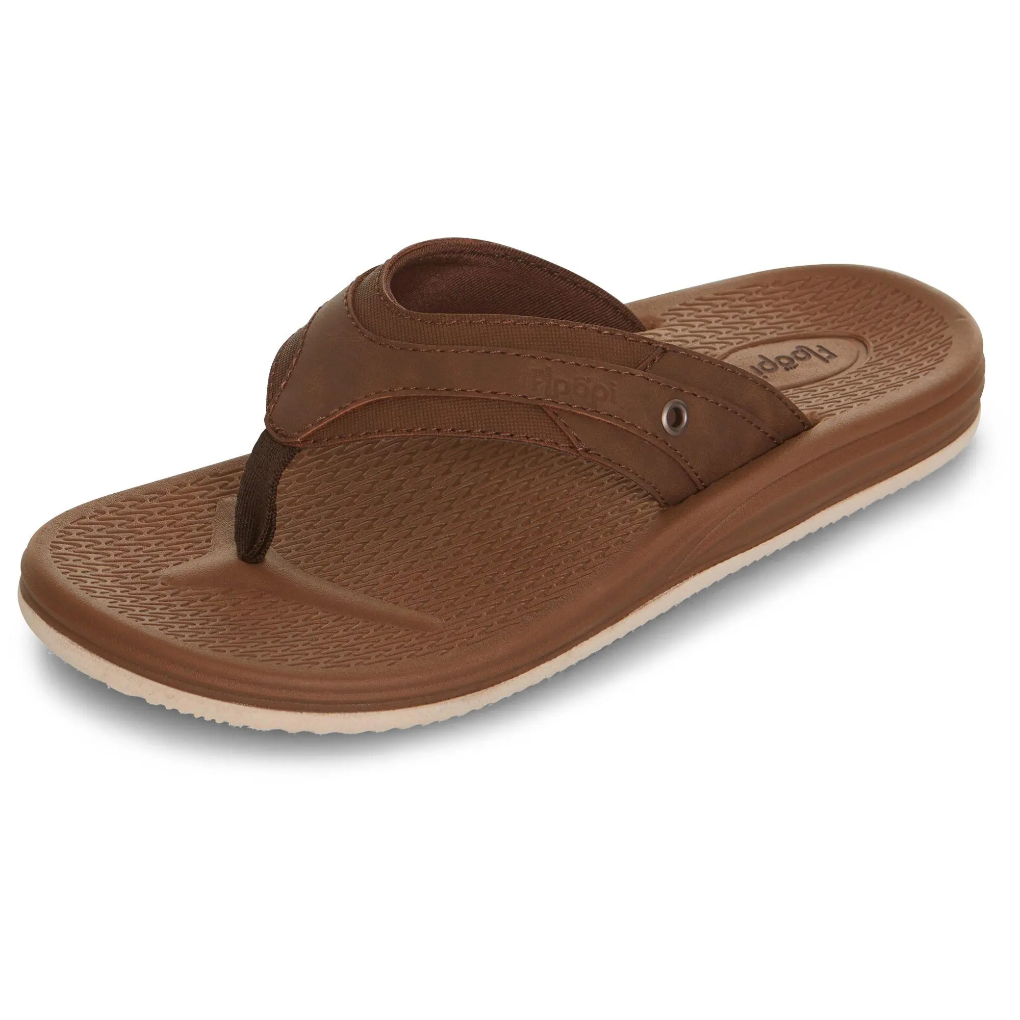 Slip into comfort and style this spring and summer with the Floopi Men's Daniel Comfort Thong Flip Flop, featuring a premium polyurethane upper adorned with a subtle button detail. The soft webbing toe post and thick, textured soft EVA footbed ensure all-day comfort, while the durable wavy tread rubber EVA non-slip outsoles provide reliable traction. From Floopi.