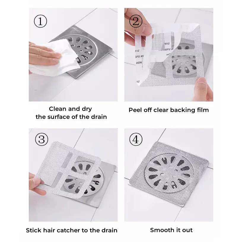 **Simple Application Process**: The application of our Disposable Shower Drain Covers is straightforward. Simply place the hair catcher cover over the bathroom floor drain, drainpipe, or sink, and gently press it in place. It's recommended to replace it every 2-3 weeks or as needed.