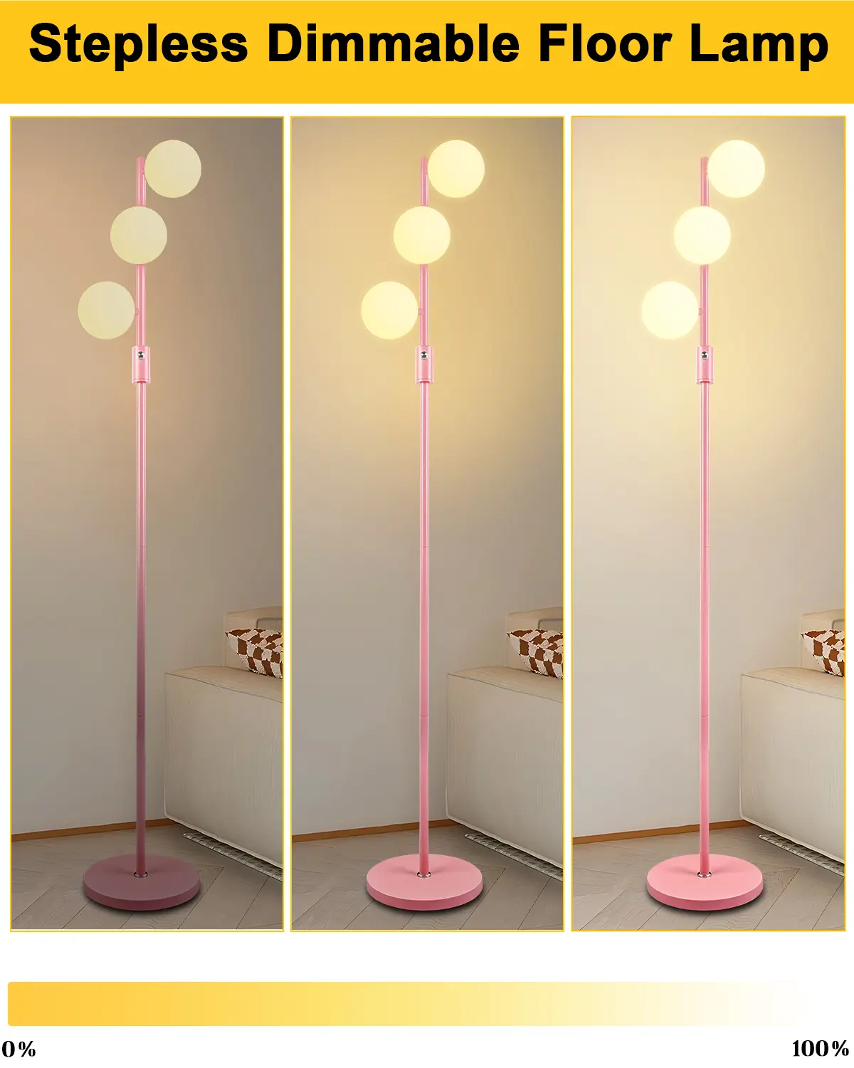 Lightdot Dimmable (Brightness Adjustable) Globe Floor Lamp, Pink Pole Standing Lamps with 3PCS 3000K G9 Bulbs, Mid Century Modern Floor Lamp for Living Room