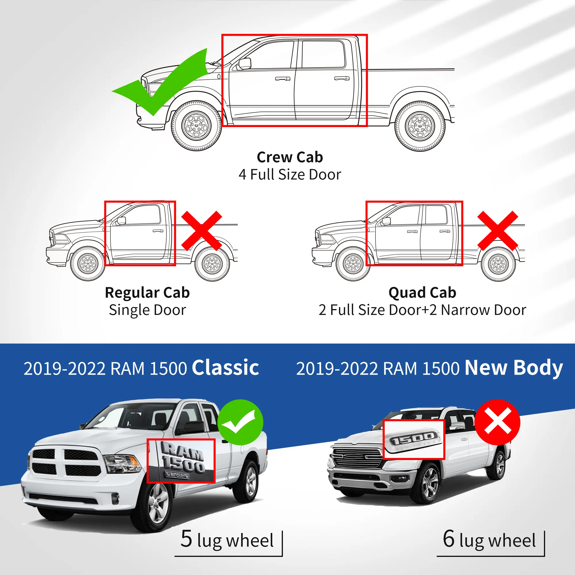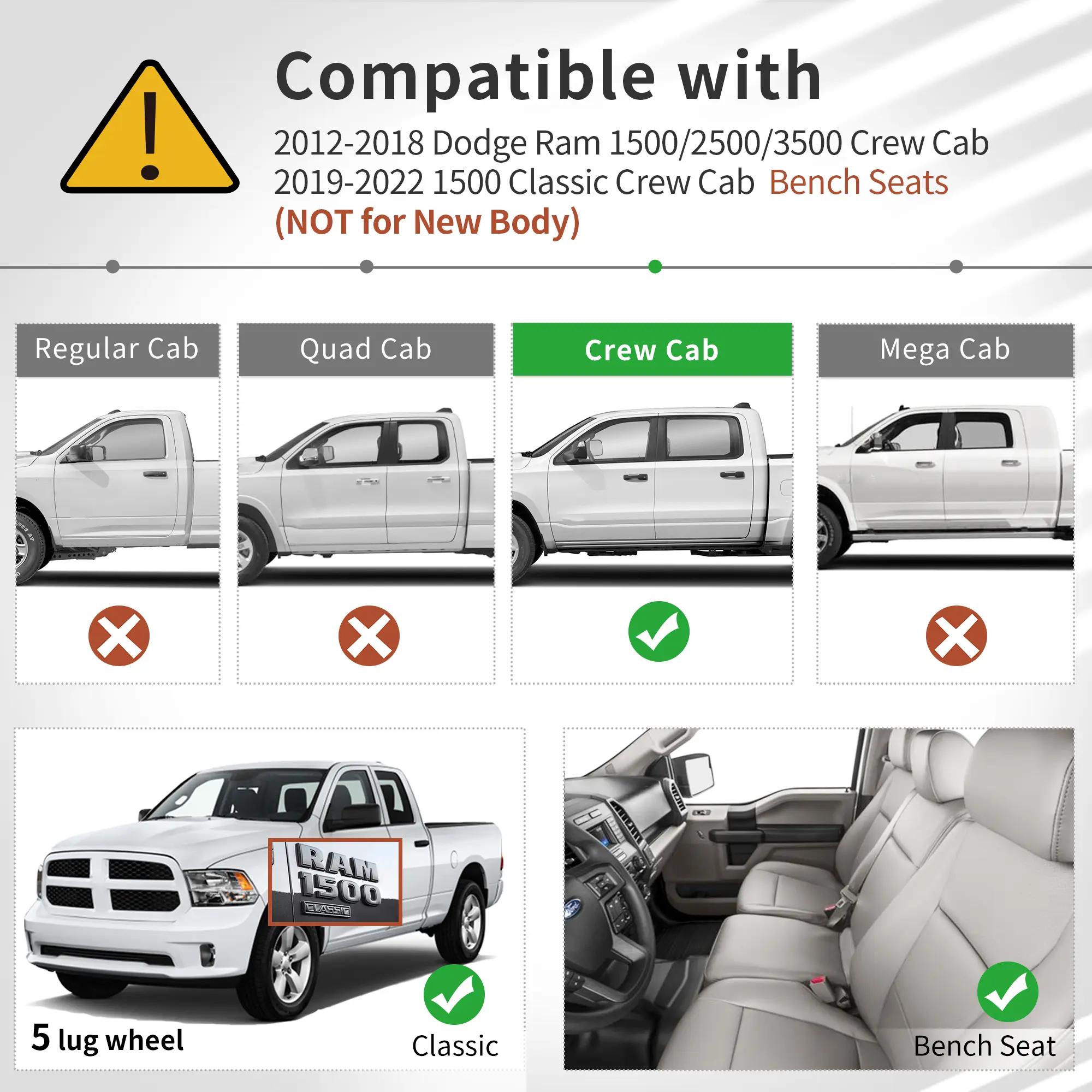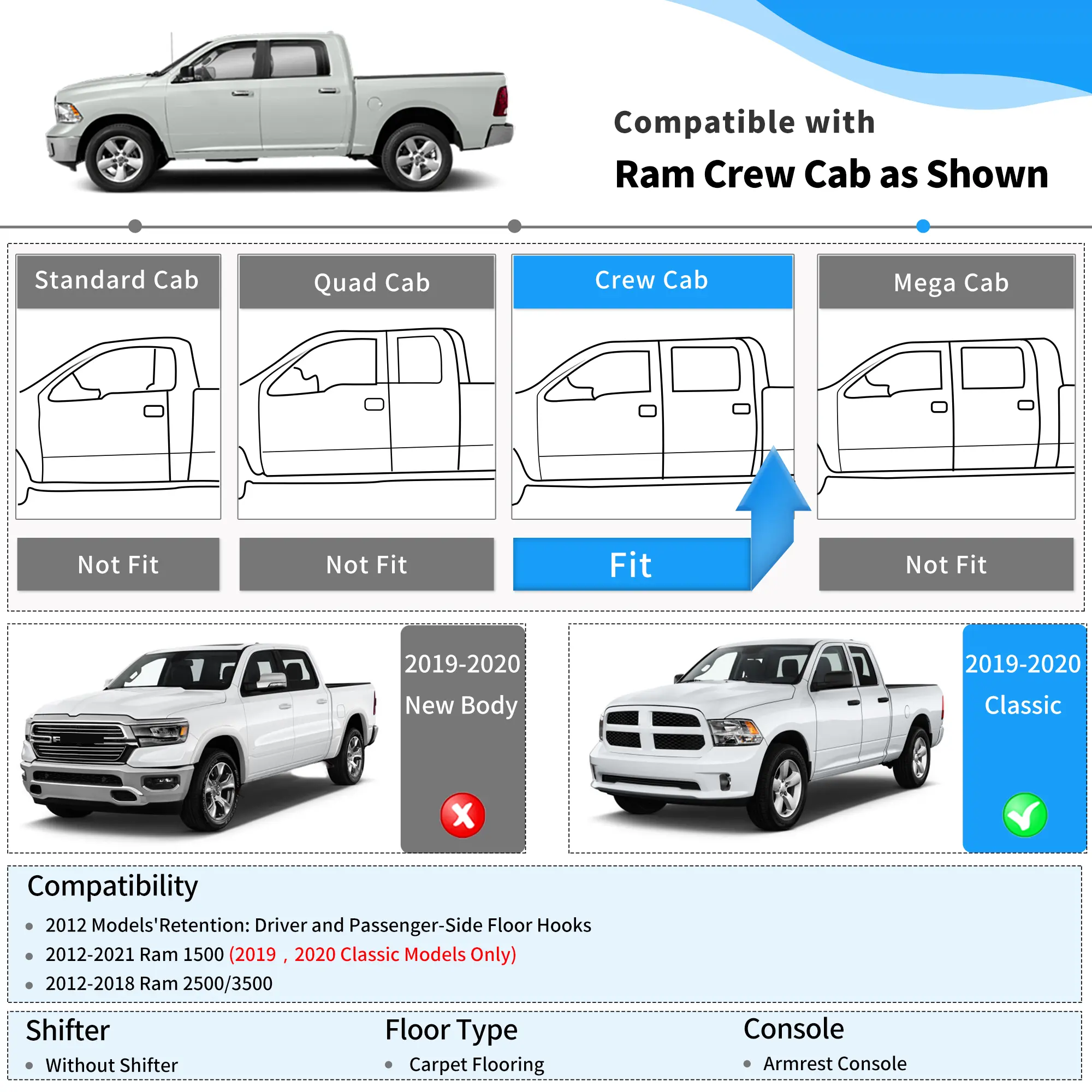 Custom Fit: Built exclusively for 2012-2018 Dodge Ram 1500 2500 3500 Crew Cab, 2019-2024 Ram 1500 Classic (NOT for New Body) With 1st Bench Seats. NOT Fit vinyl flooring, Fits for Without 4x4 Shifter, Fits for Armrest Console; 2012 for models have Driver and Passenger-Side Floor Hooks ONLY; Does not fit vehicles with vinyl flooring; Distinct precision digital laser scanning allows it to consistently hug the contour of your ride’s interior.