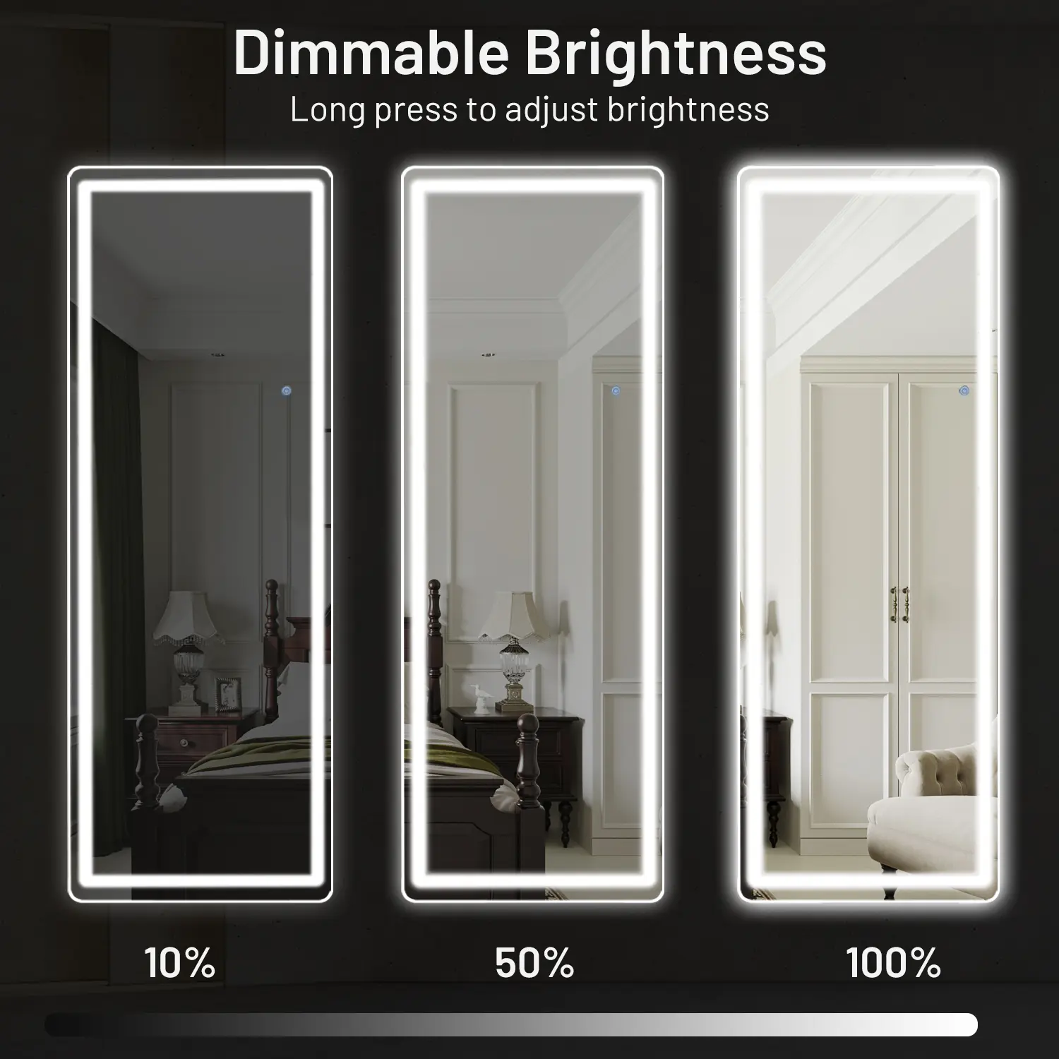 ·3 COLORS & ADJUSTABLE BRIGHTNESS: The mirror's brightness and color temperature are controlled via a smart touch button. A short press changes the color temperature between white light, warm light, and yellow light. A long press adjusts the brightness to your preference.