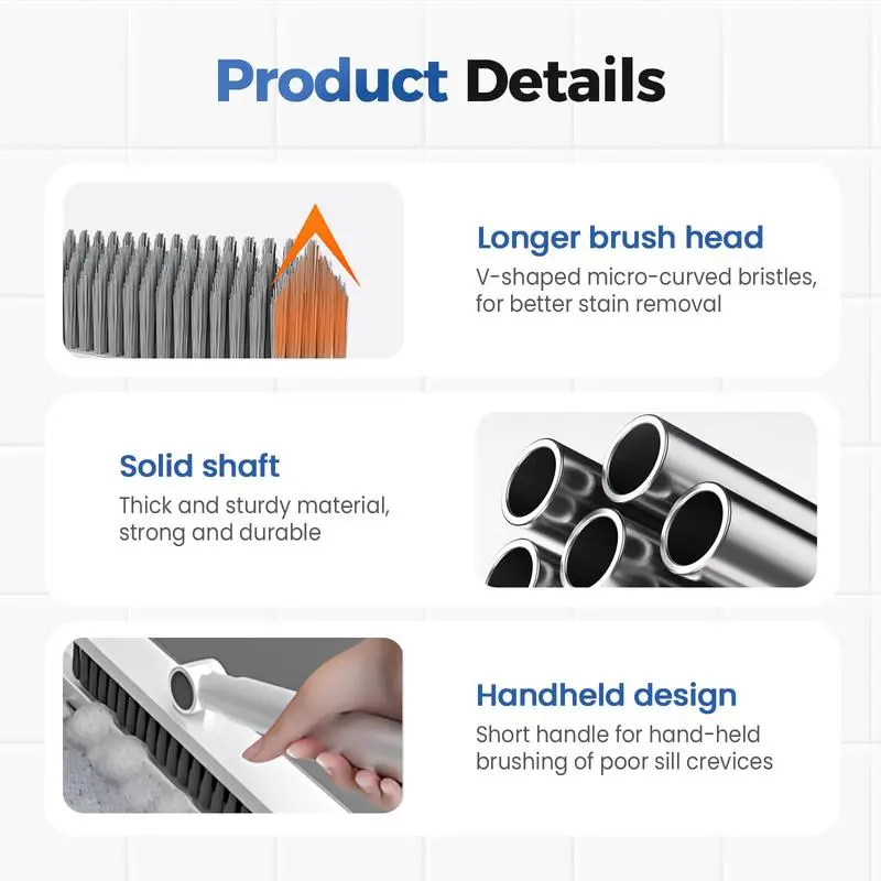 ·【V-Shape Heavy Duty Corner Cleaning】V-shape stiff bristle brush is constructed with a stainless steel pole and PP brush head. Its robust bristles maintain their shape, allowing deep cleaning of coarse floors, tight corners, and fine bathroom tile grooves.