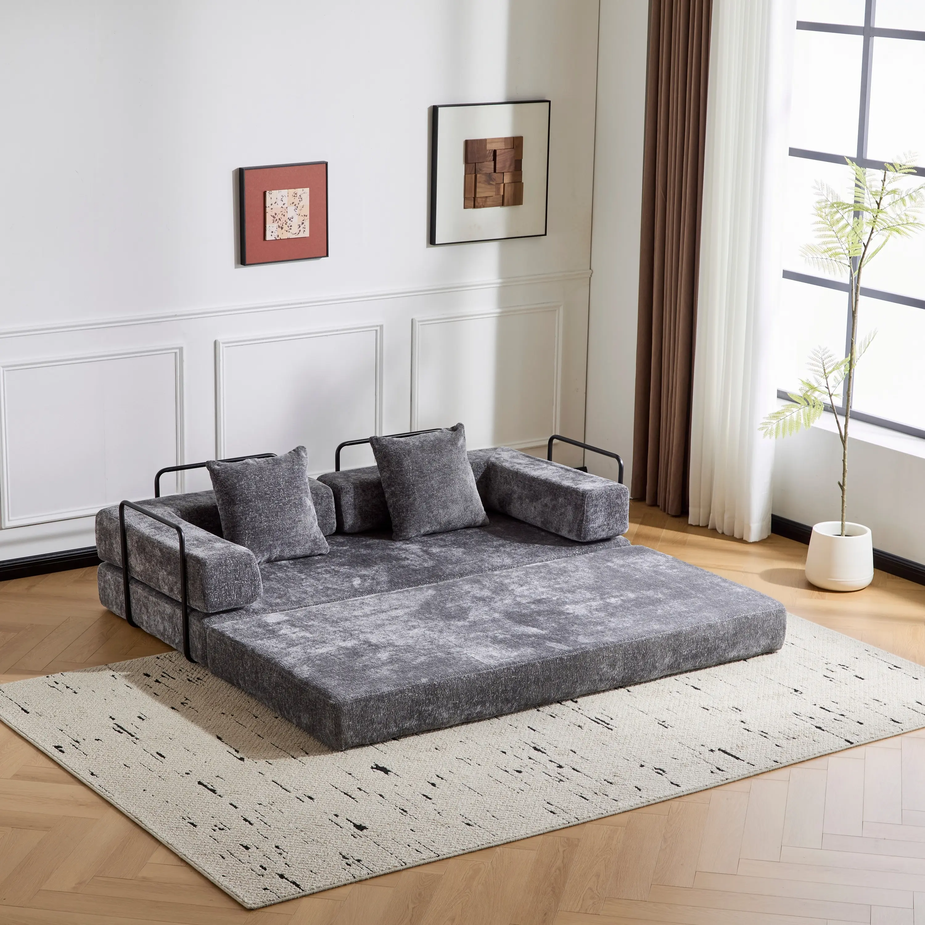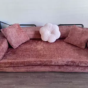 Love it! The box is small and narrow so no need to worry about fitting it through a small space. The chenille fabric is the way to go if you have pets! The fur picks up easily. One call out is that the couch sits pretty low esp if you're tall like me.I still 💜 the versatility,color and fabric!