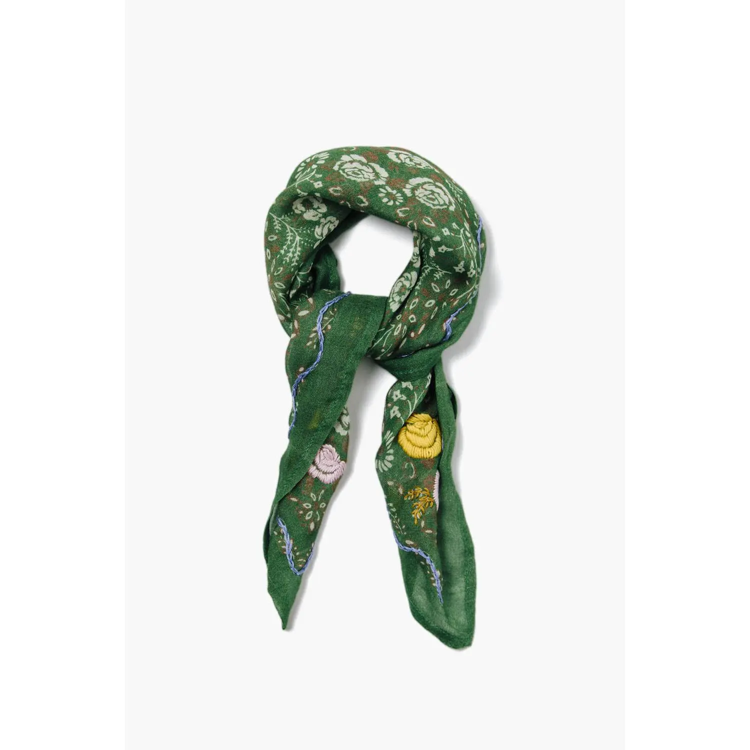 Love the embroidery and look of this scarf tied around the neck. Just tie it once to get the same look as the model and seems to stay put. Double knotting isn’t possible with this size.