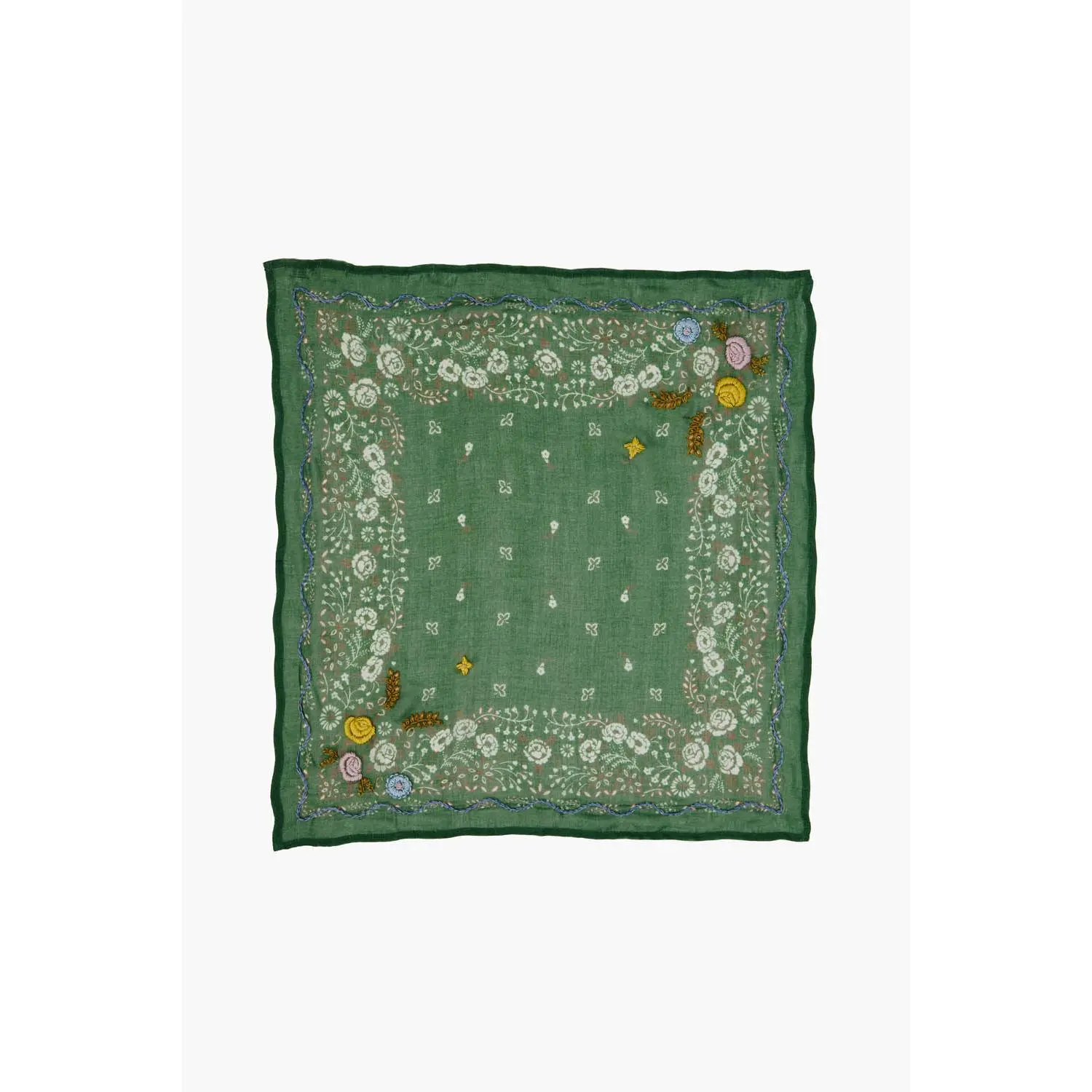 Lovely little scarf, with beautiful embroidery detail, which I appreciate. The scarf is soft to the touch, with a beautiful blue hue.