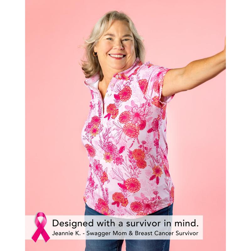 Introducing the Floral Fighter Polo: a heartfelt tribute to the indomitable spirit of cancer survivor, Jeannie Knowles. This unique shirt, designed with love by Jeannie's daughter, showcases flowers intricately crafted from uplifting words of affirmation. Every petal tells a story of perseverance, resilience, and hope. Perfect for showing support or as a stylish reminder of the power of positivity. Wear it proudly, and celebrate the unwavering spirit of fighters like Jeannie.