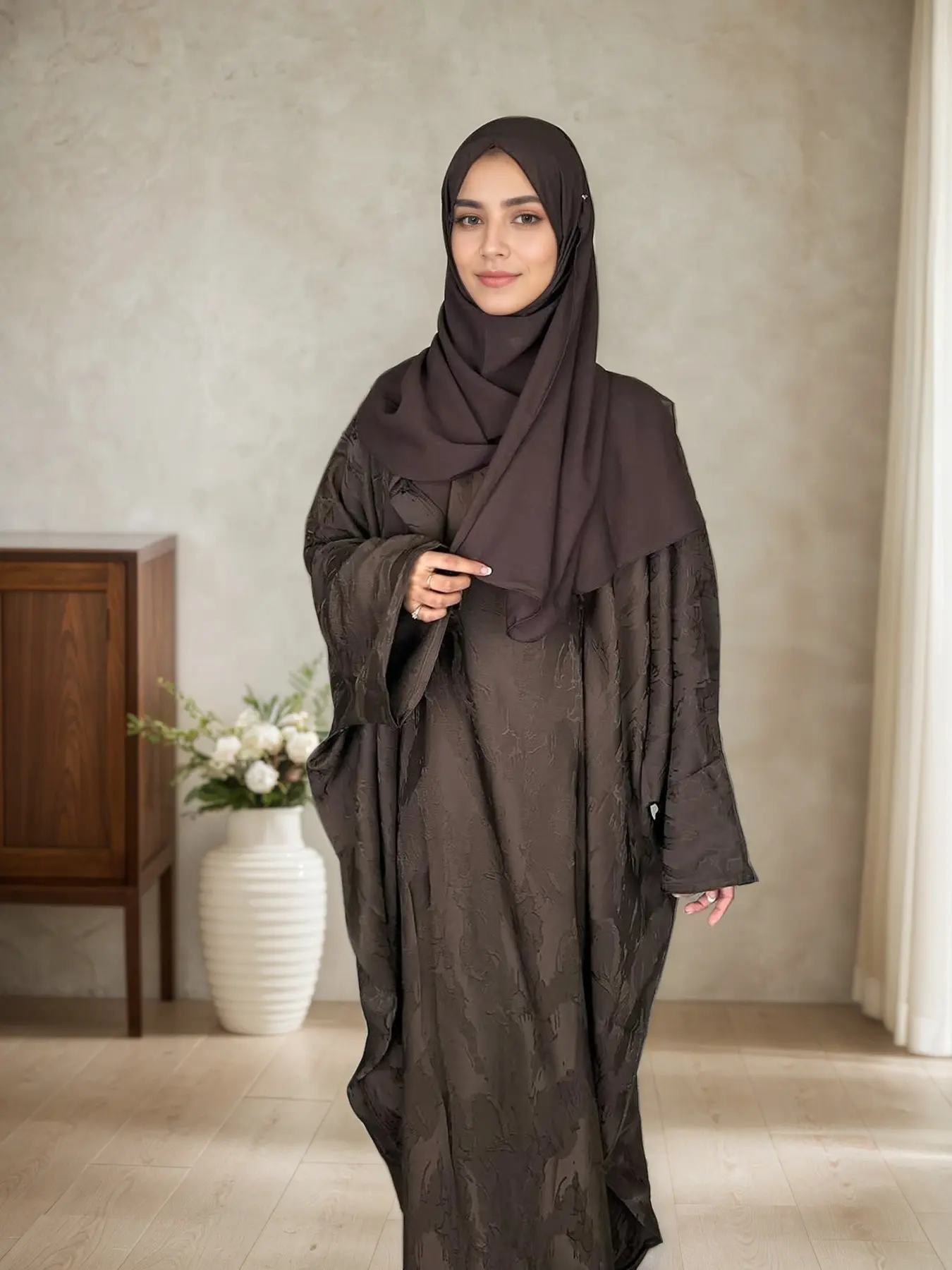 Very nice Abbaya and very elegant. The fabric is awesome. I had purchased 2 ,dark wash navy and black I loved everything about the Abbaya. . Delivered on time.