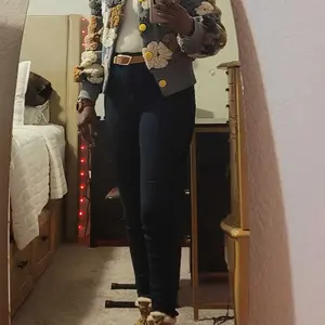 Jacket flowers was dirty and had lint balls!! I had to wash it. It's really a nice statement piece. It is warm.over all it's nice just didn't like the delivery of it. I am 5'7 160 I got a large. It's right fut.