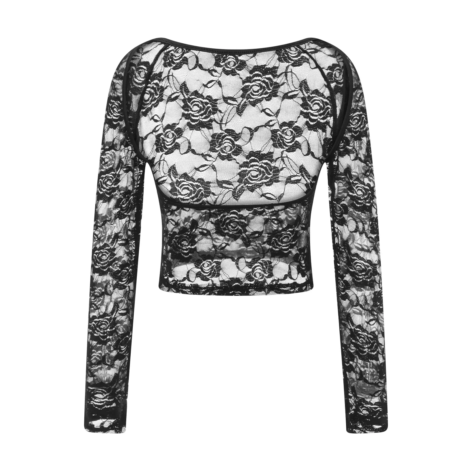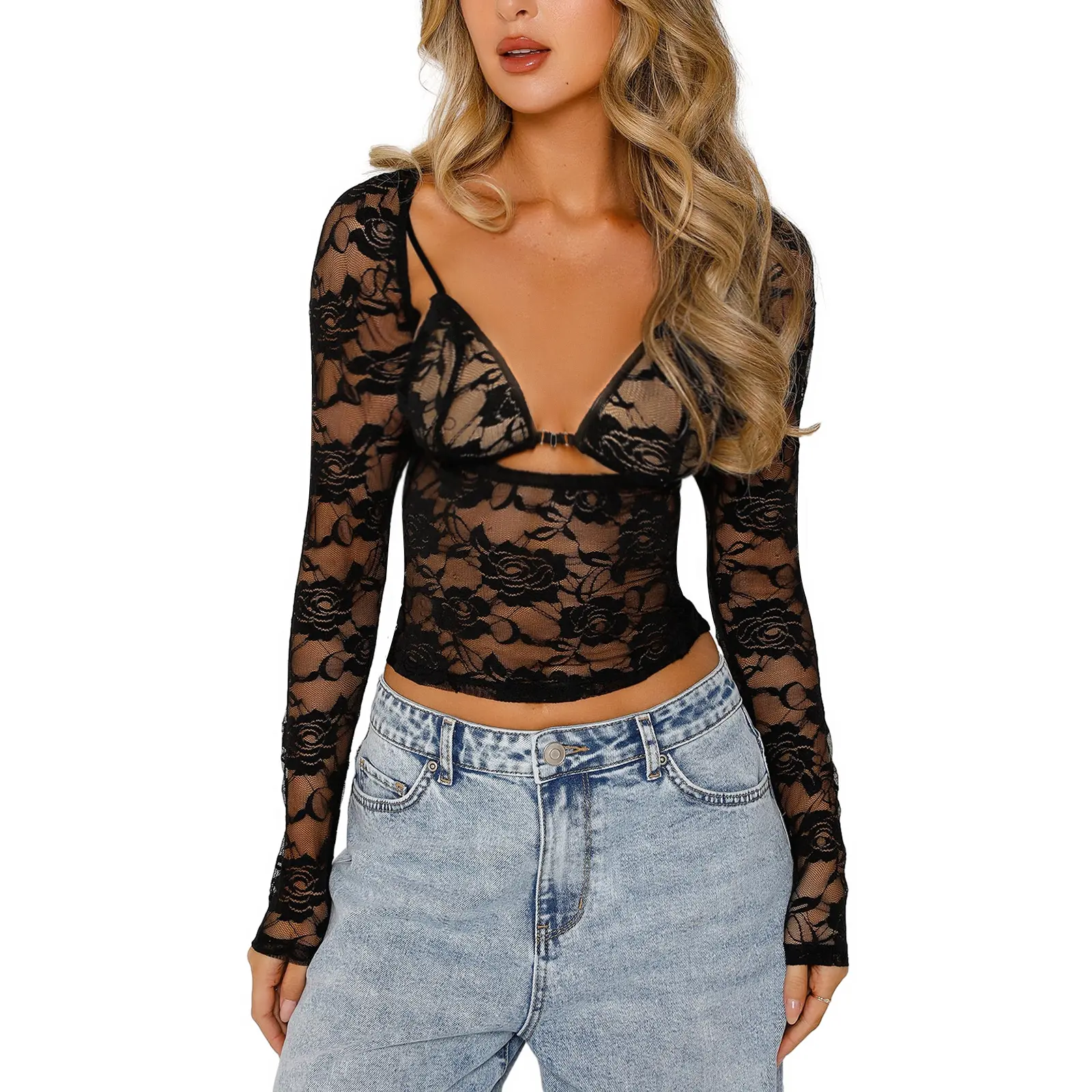 Delicate floral lace pattern, sheer, plunging cut, long sleeves, cropped length, lace tops for women, cropped T-shirts for women, matching bra, slim fit, stylish and unique streetwear designs to make you more attractive force.