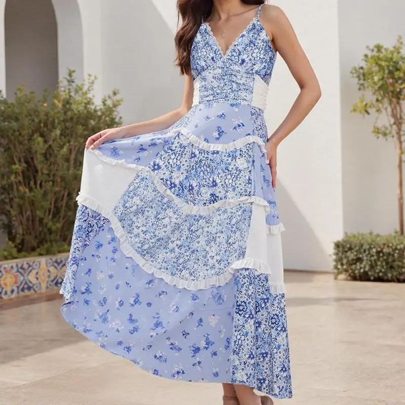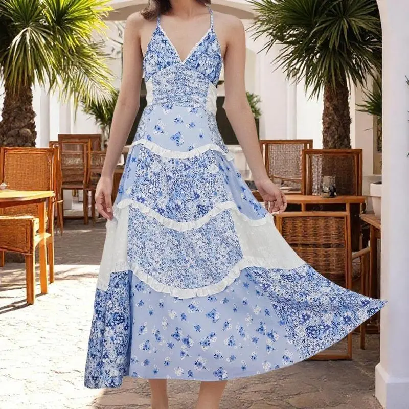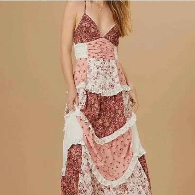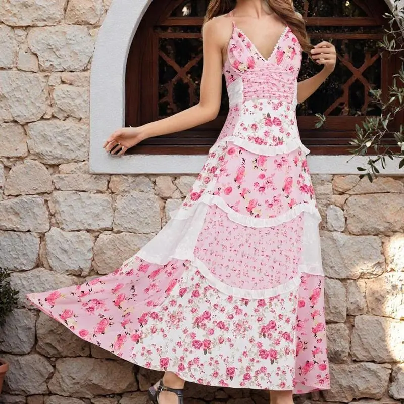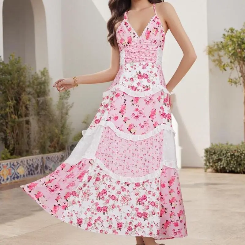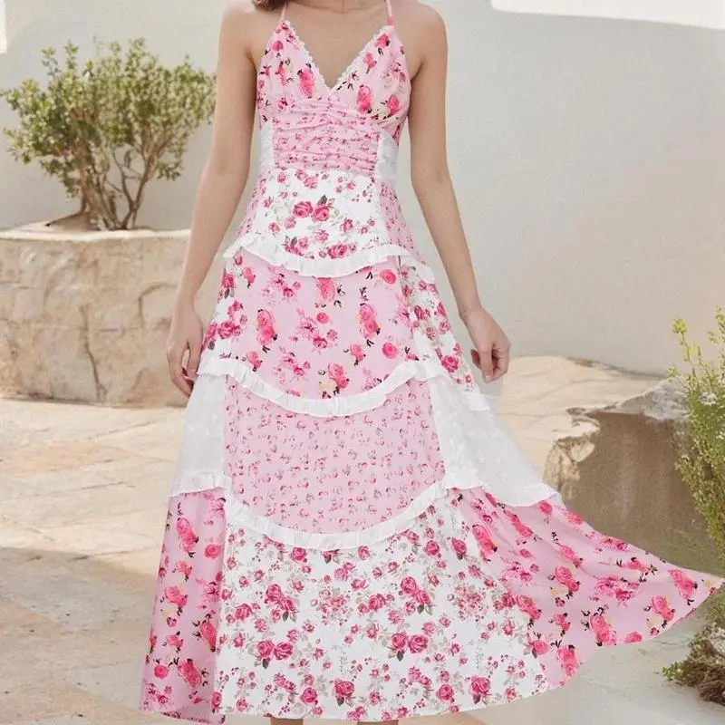 5. Floral Lace Patchwork Spaghetti Strap Dress - Available in Pink or Blue for a Chic Summer Look