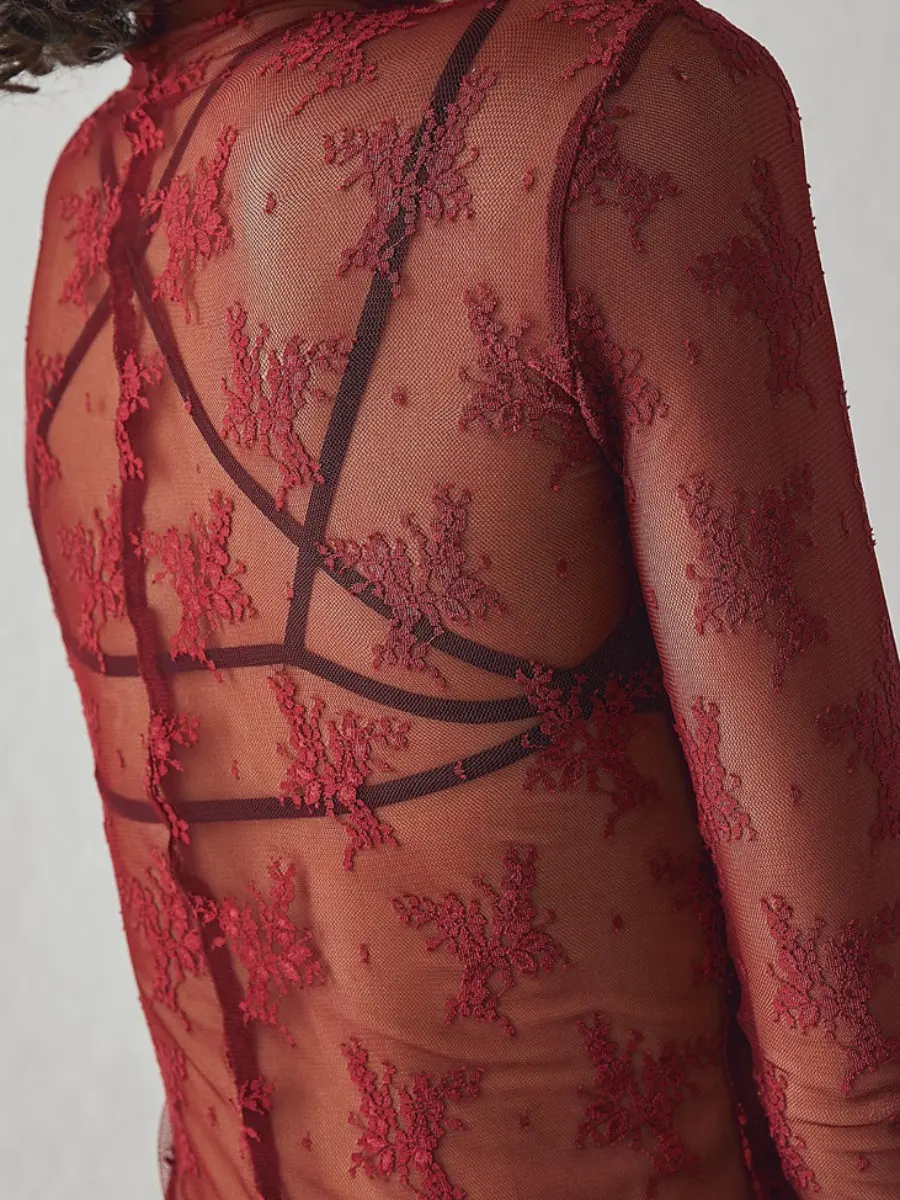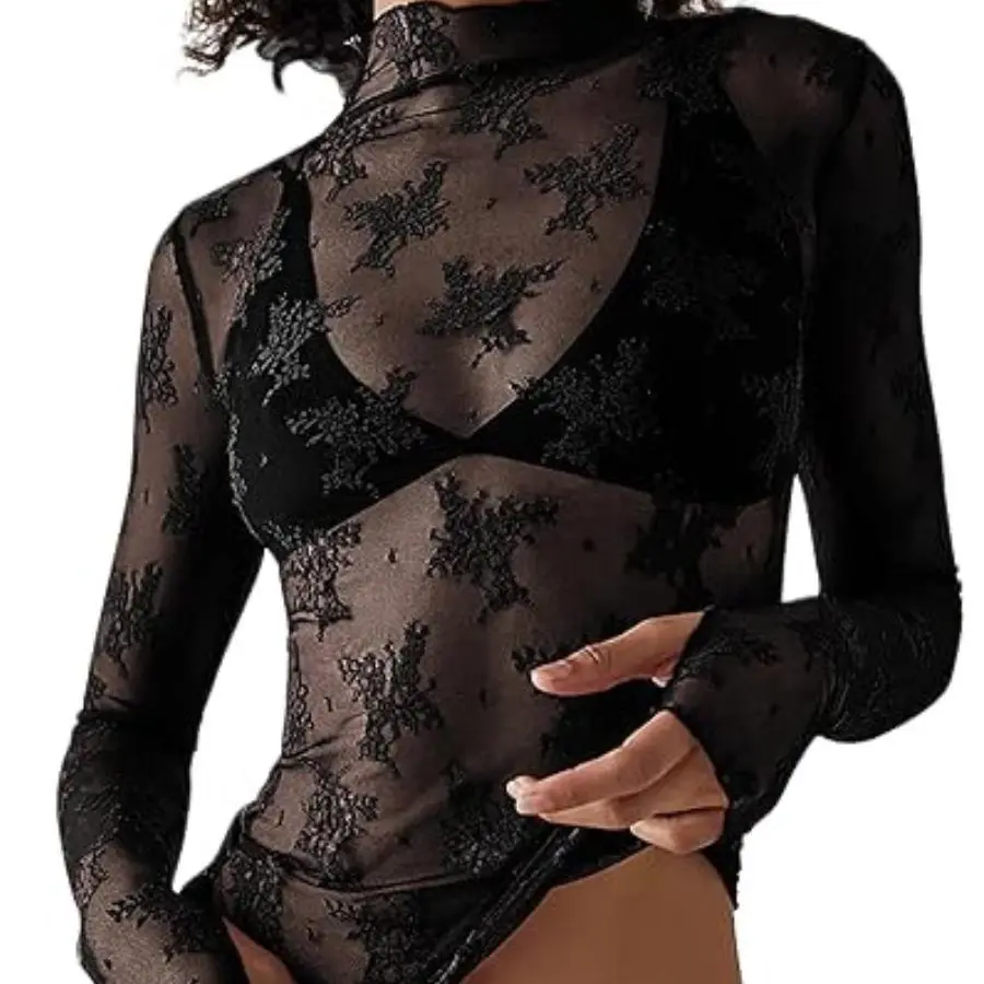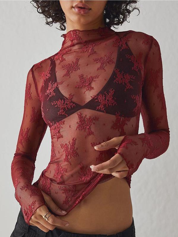 Women's Floral Layering Lace Tops With Thumb Hole, Mesh See Through Slim Shirt All Seasons, Micro Elasticity Long Sleeve Mock Neck Sxy Style