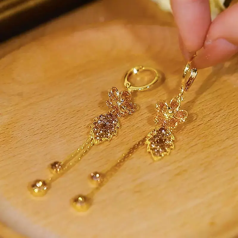 LisiZen Floral Leaf Tassel Earrings 14K Gold Plated Sparkling Zircon Design, Chic Statement Jewelry Unique Fashion Earrings New Arrival DZEH2601 SpringStatements