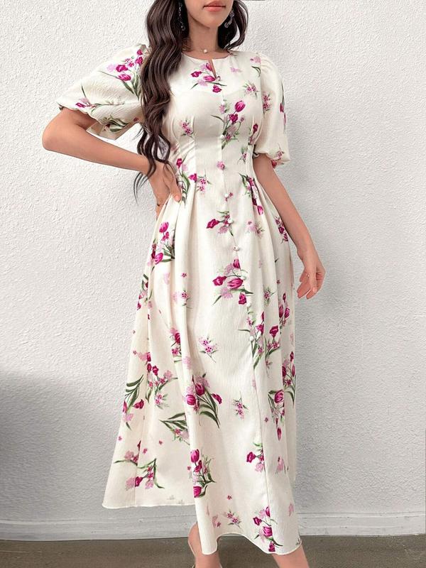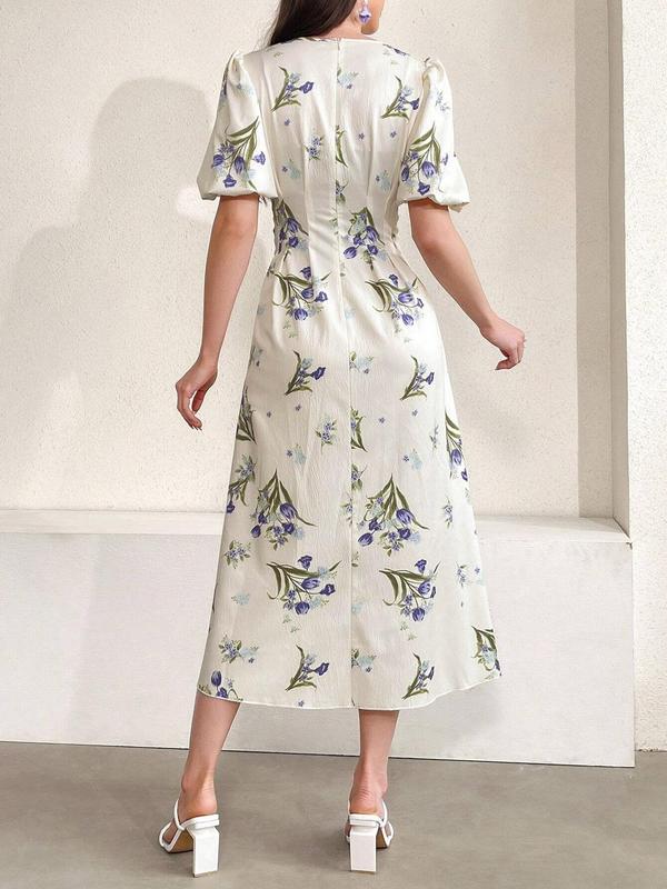 Women's Floral Print Puff Sleeve Dress, Elegant Short Sleeve A Line Dress for Party Holiday Wedding Guest, Ladies Clothes for All Seasons🙌🏼
