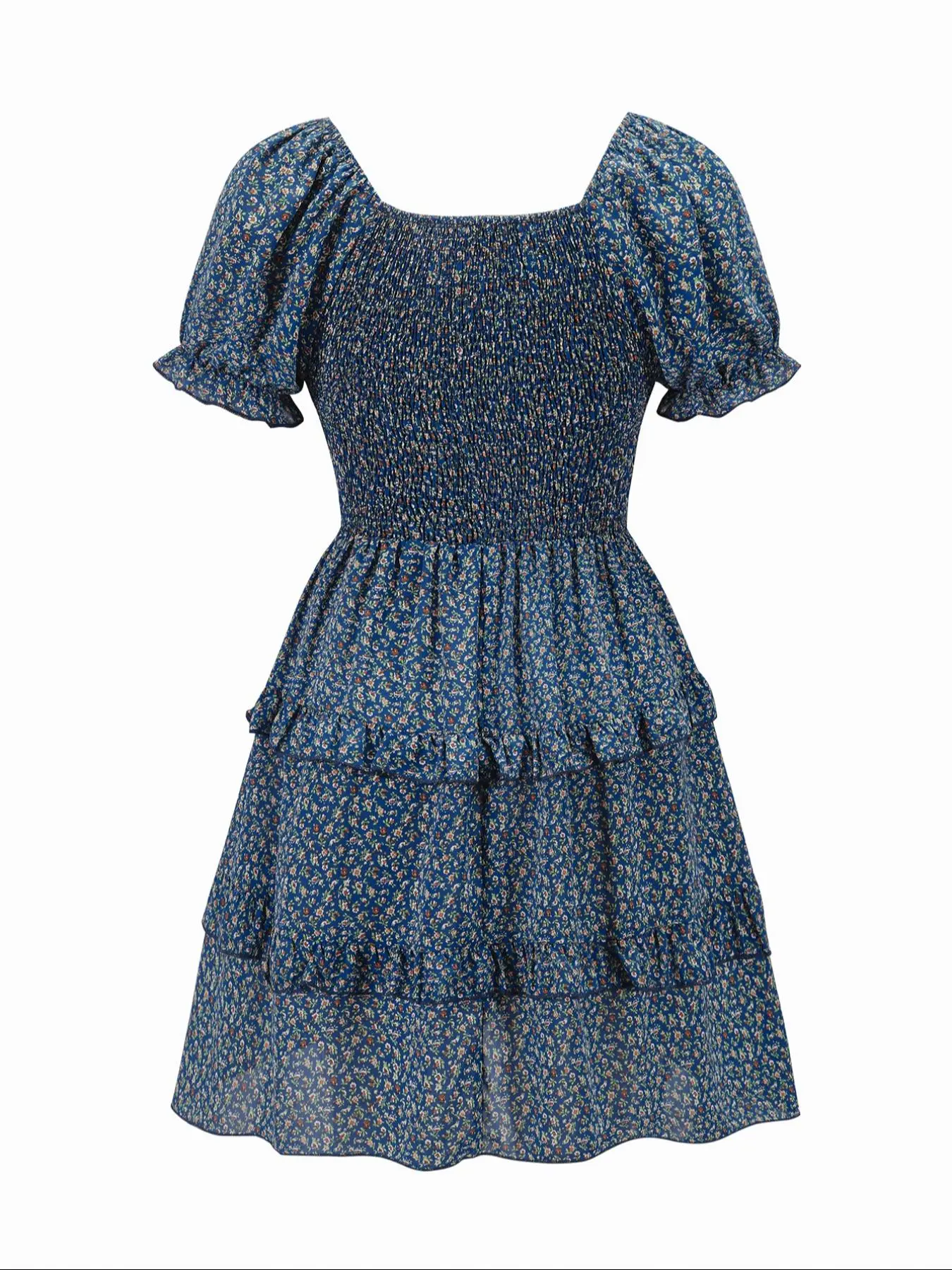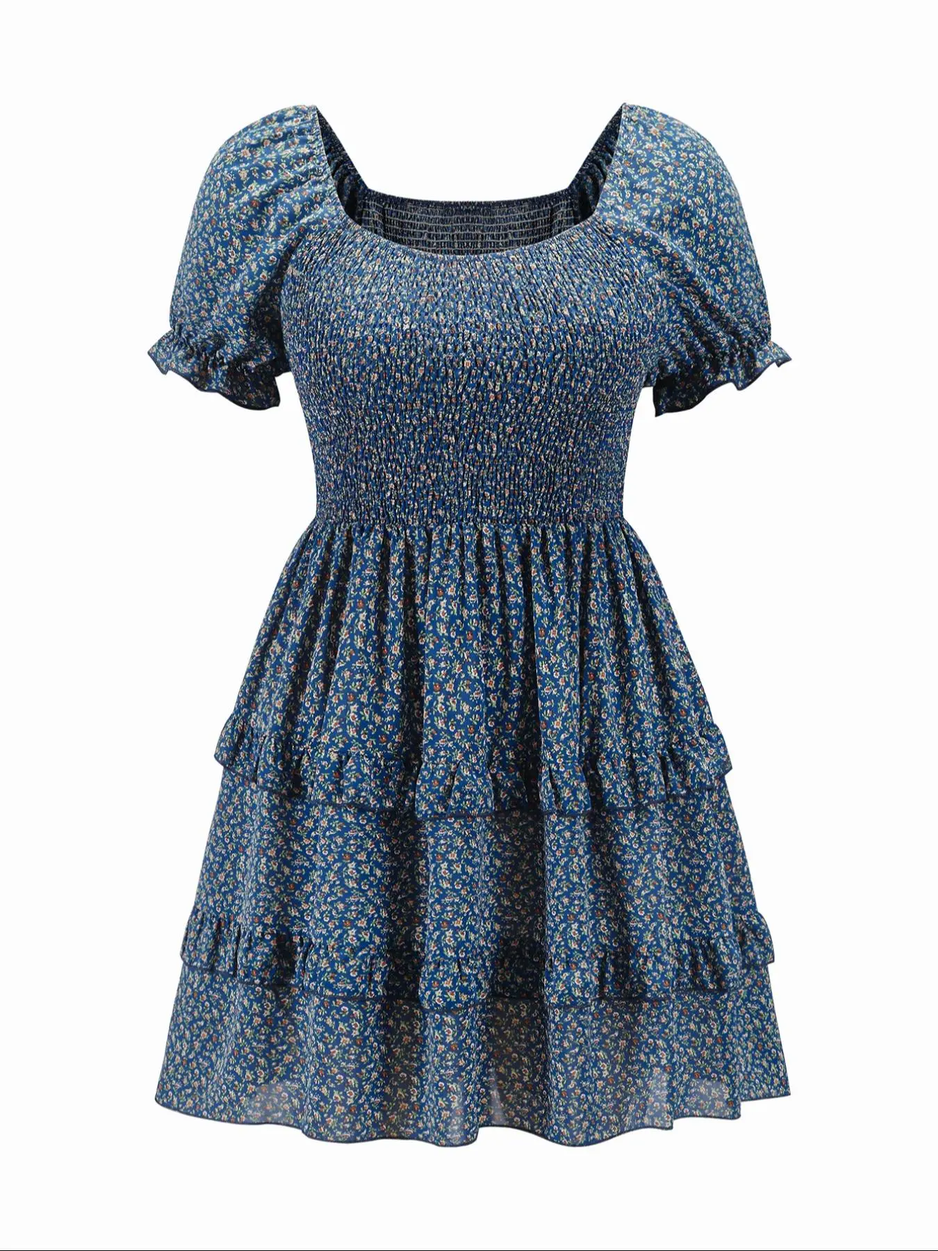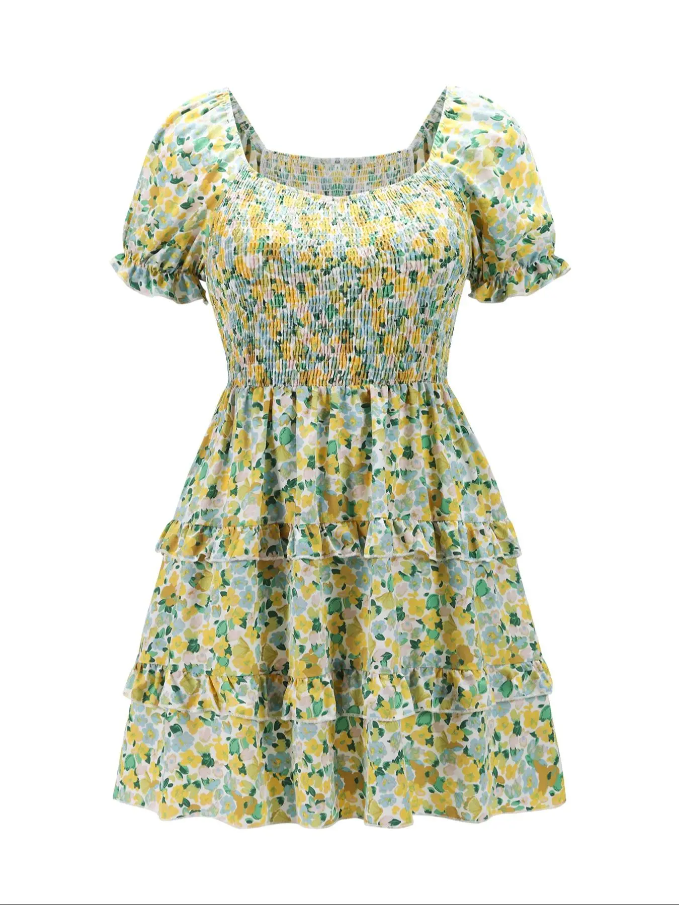 Beautiful multiple bright colors floral tiered print dress nonwrinkling tea length fabric dress soft to touch.