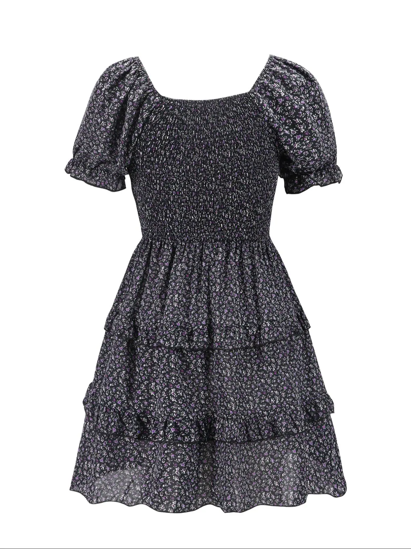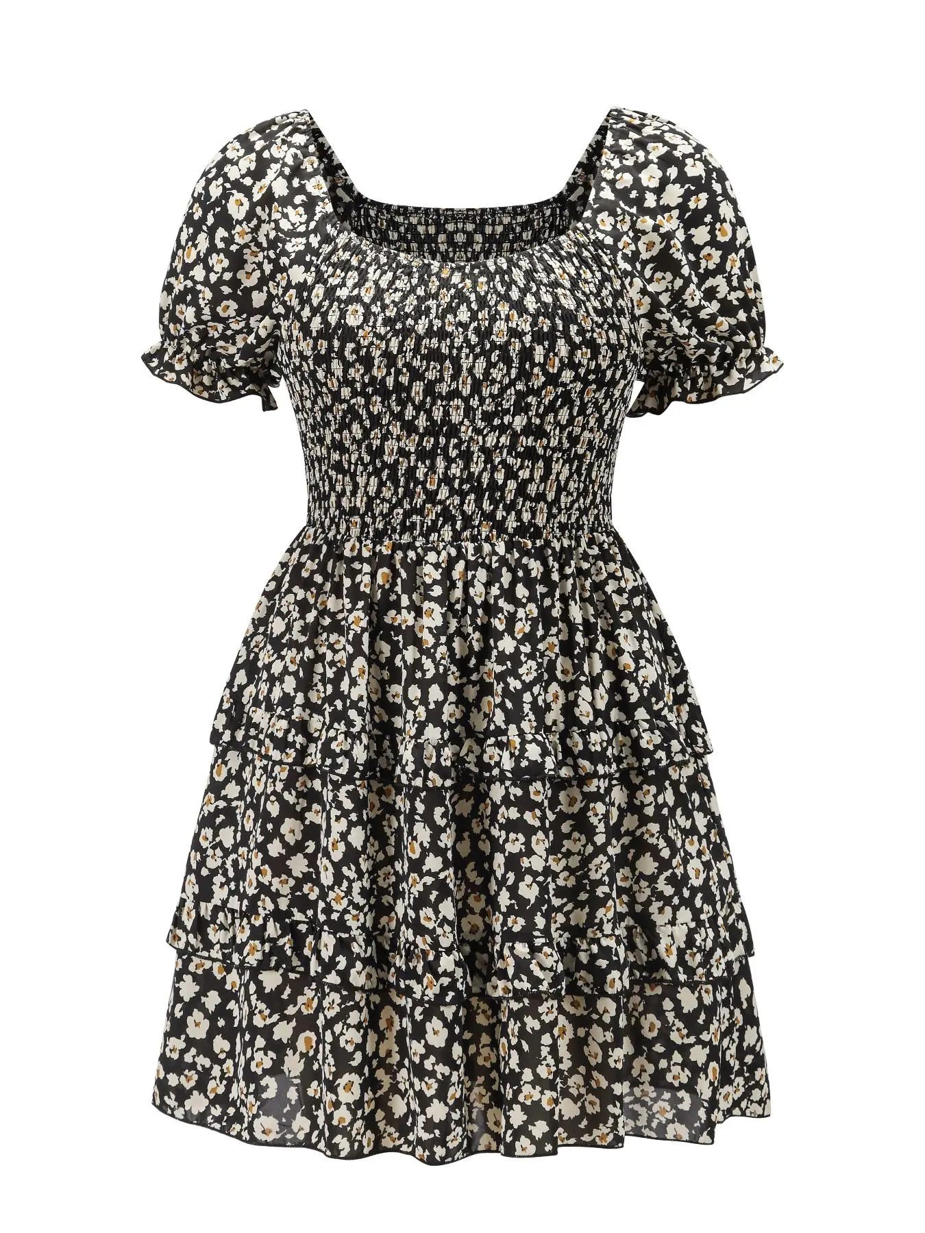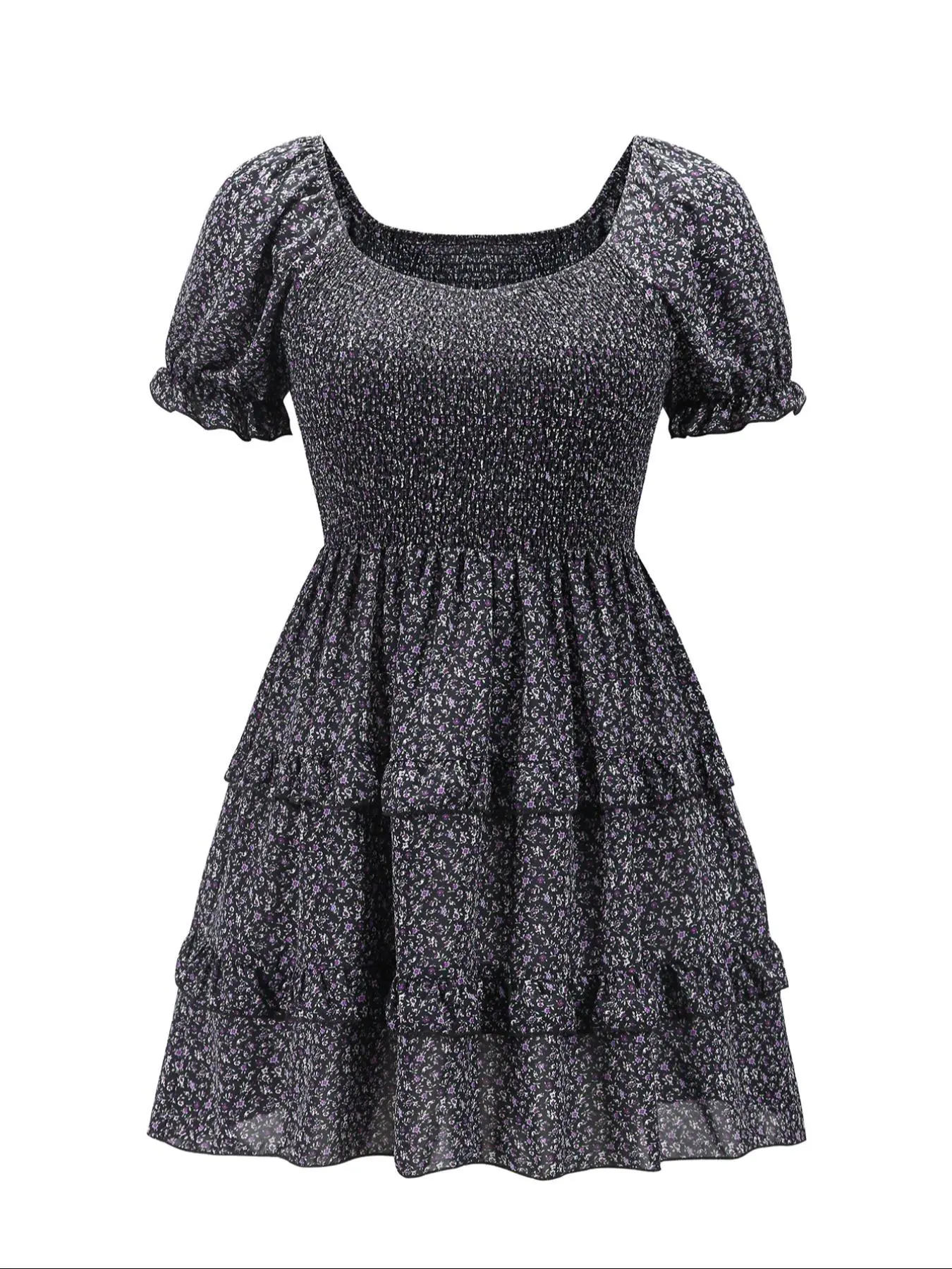 Beautiful multiple bright colors floral tiered print dress nonwrinkling tea length fabric dress soft to touch.