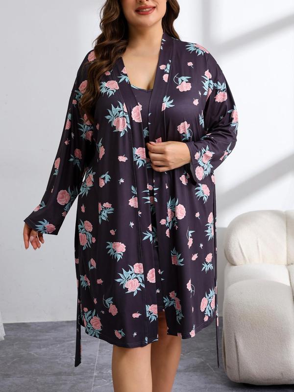【Plus Size】 Floral Print Cami Nightdress & Bathrobe Set, Casual Soft Comfortable Nightdress & Long Sleeve Dressing Gown, Women's Sleepwear for All Seasons, Casual Comfy Nightdress