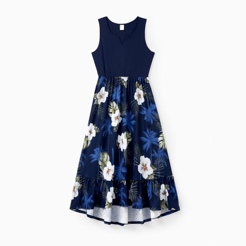 ·Product Introduction:A blue tropical print family set featuring a dark blue tee with a V-neck design, a skirt with a coconut tree and flower print, and a fit-and-flare skirt design.