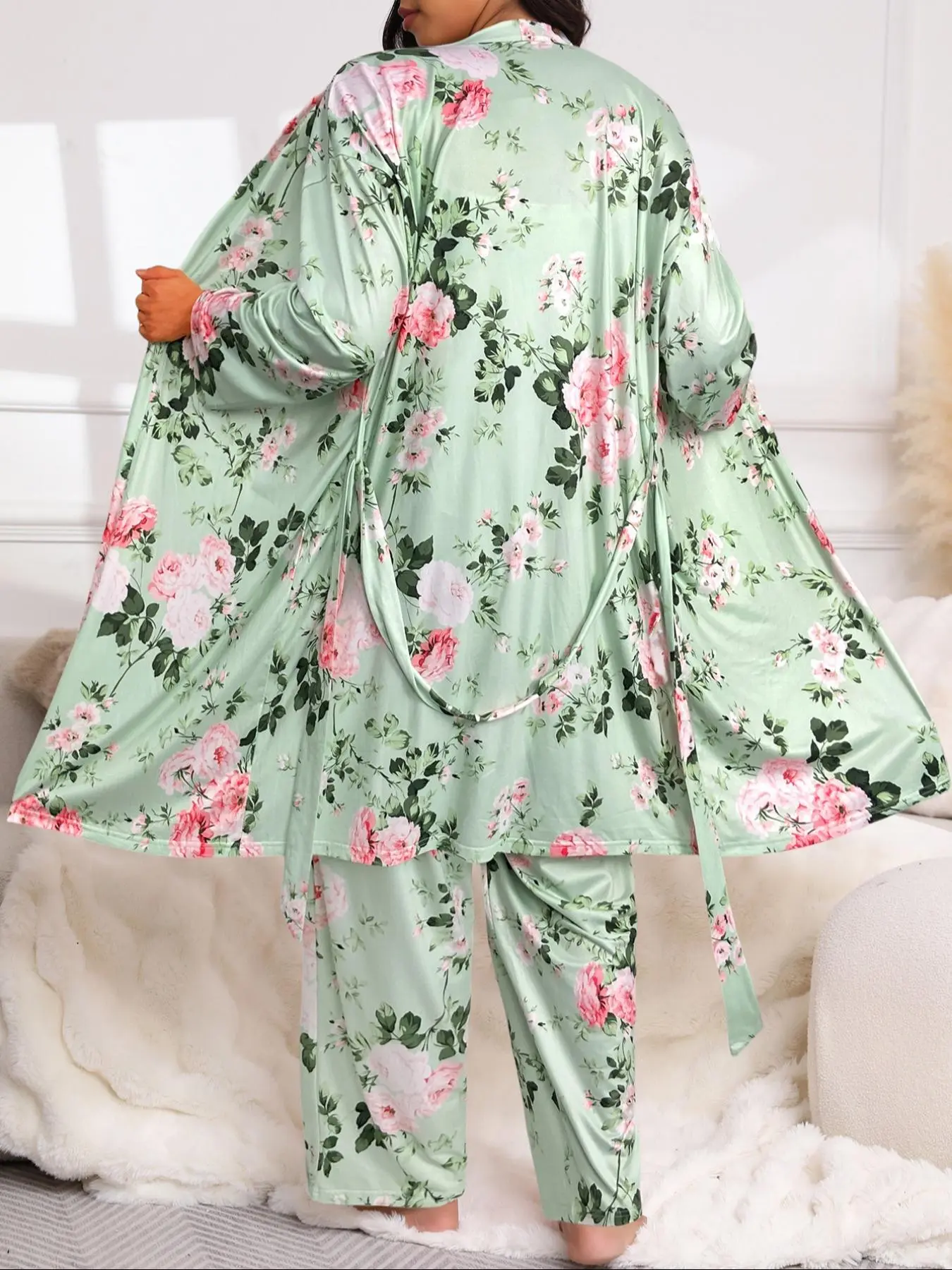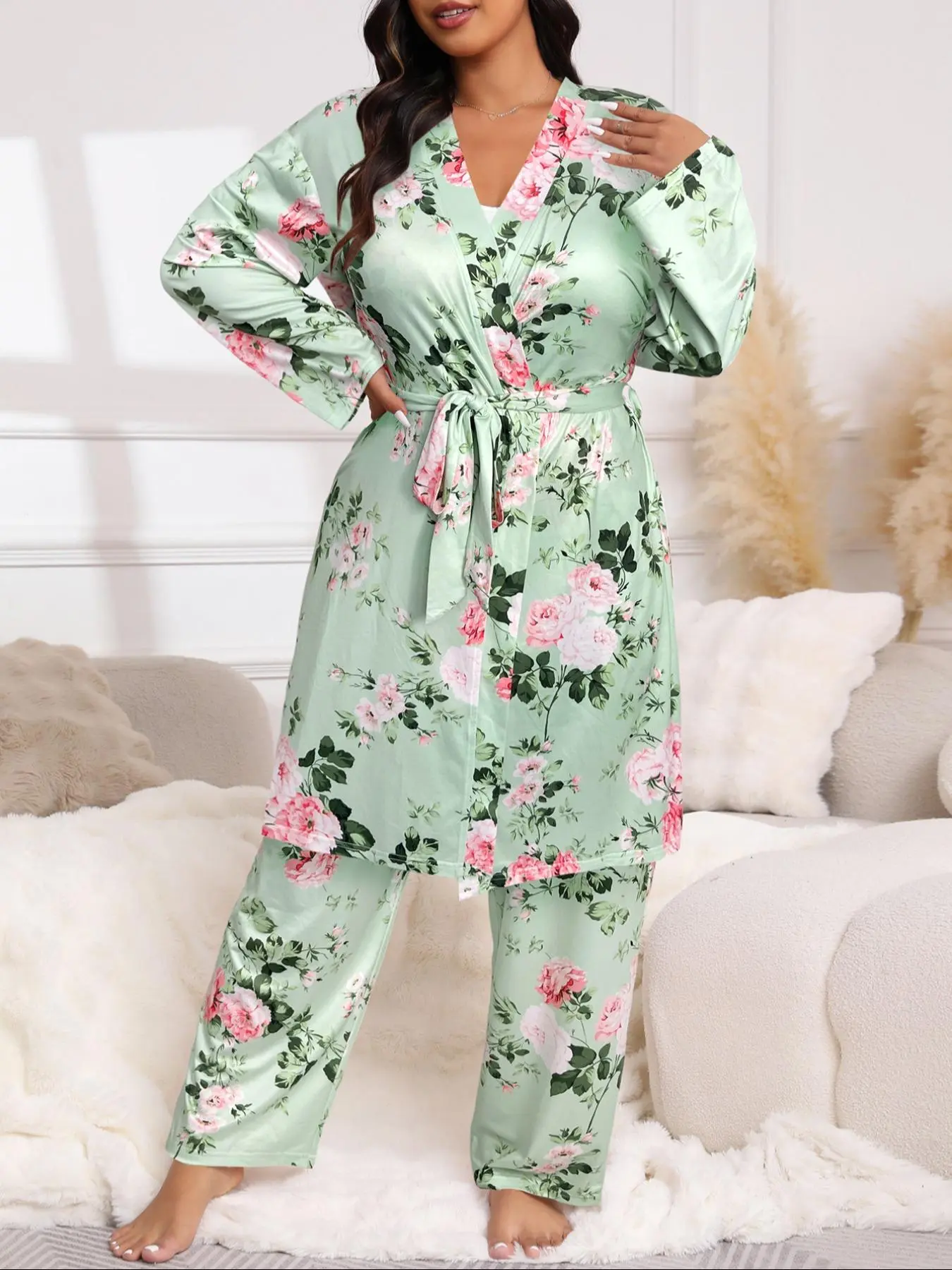 This plus-size three-piece pajama set features a mint green floral print cami, pants, and belted robe, blending comfort and elegance for stylish sleepwear or lounging. #plussizesleepwear #chicandcozy #FloralPajamas #sleepwearstyle #pajamasetloungewear