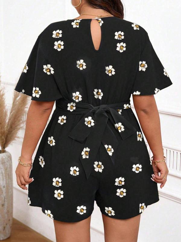 【Plus Size】 Floral Print Rompers, Womenswear Casual Fashion Short Sleeve Romper for Daily Outdoor Wear, Women's Plus Clothing for All Seasons
