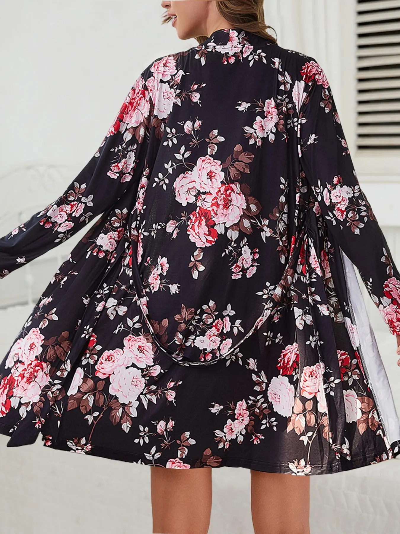 Women's Floral Print Belted  Robe & Cami Nightdress Two-piece Set, Casual Comfy Loungewear Set for Women, Ladies Sleepwear for All Seasons