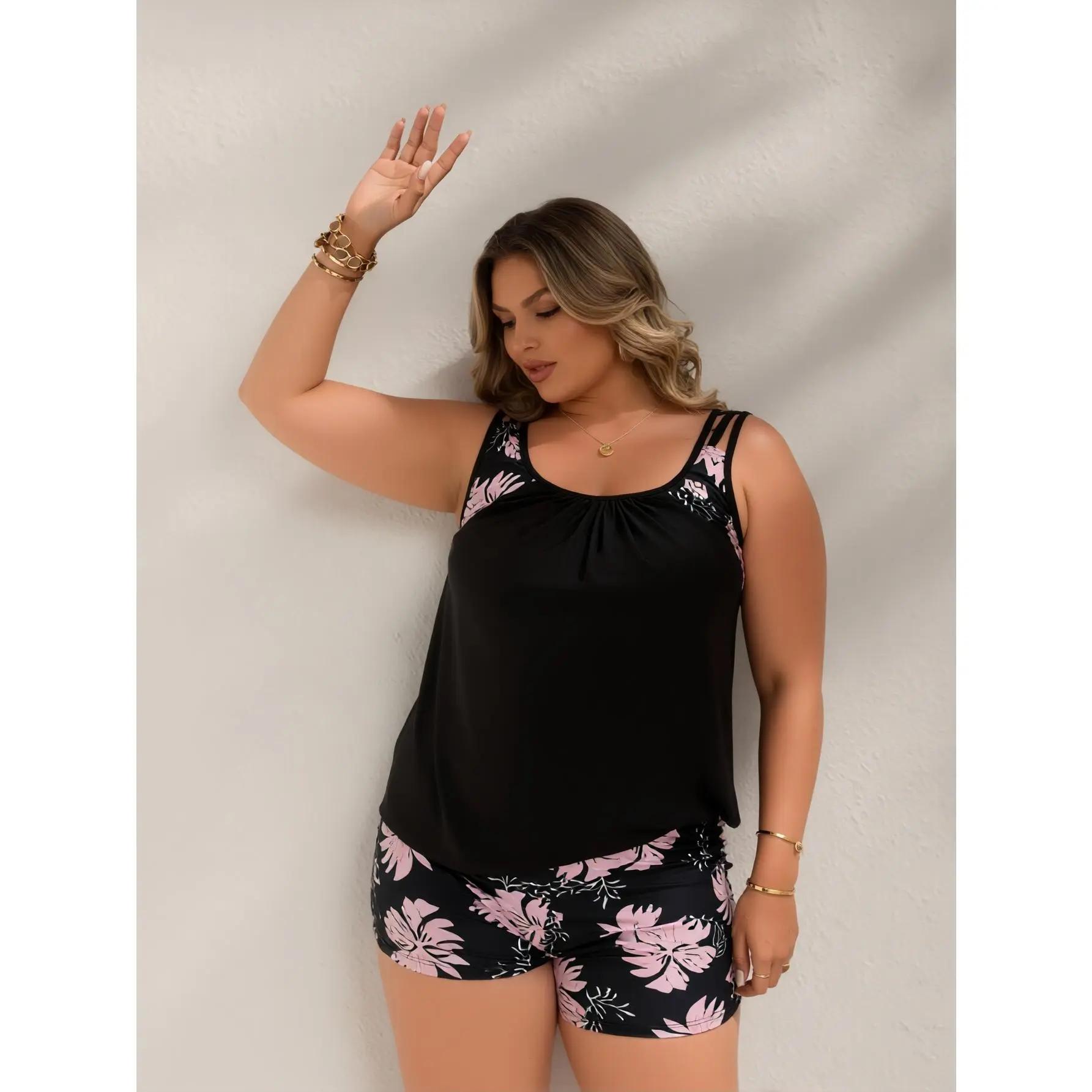 5. BlushHub Floral Print Ruched Tankini with Boy Shorts - Black & Pink Plus Size Two-Piece Bathing Suit