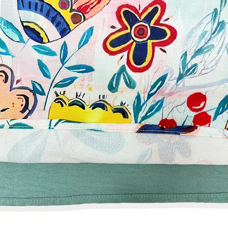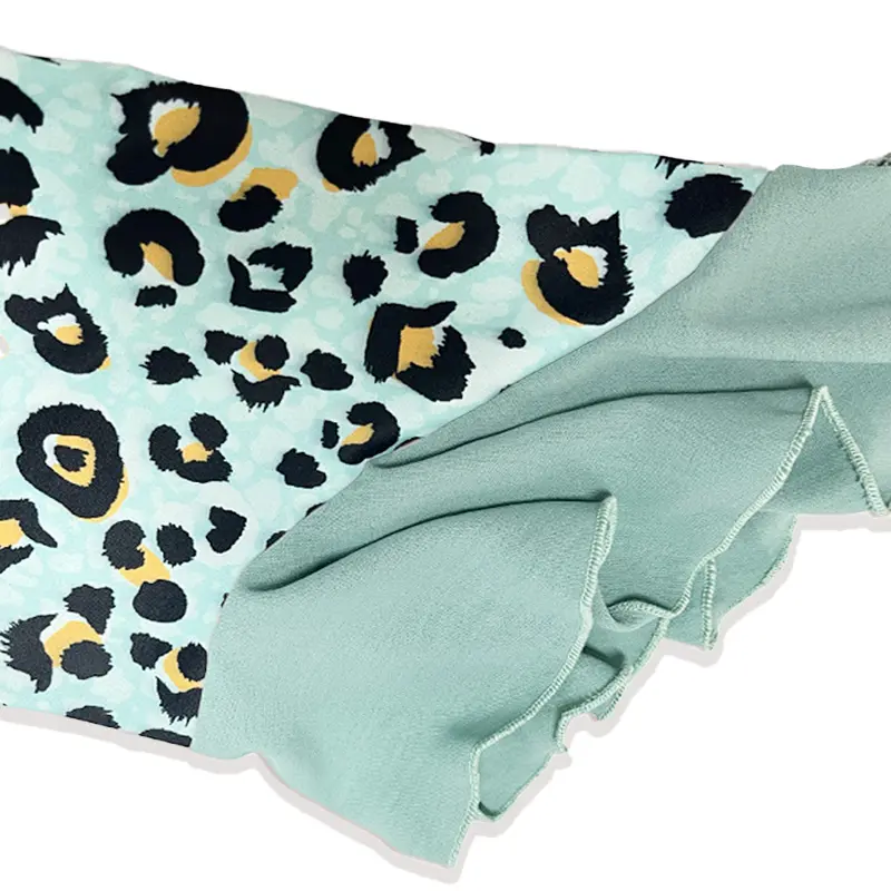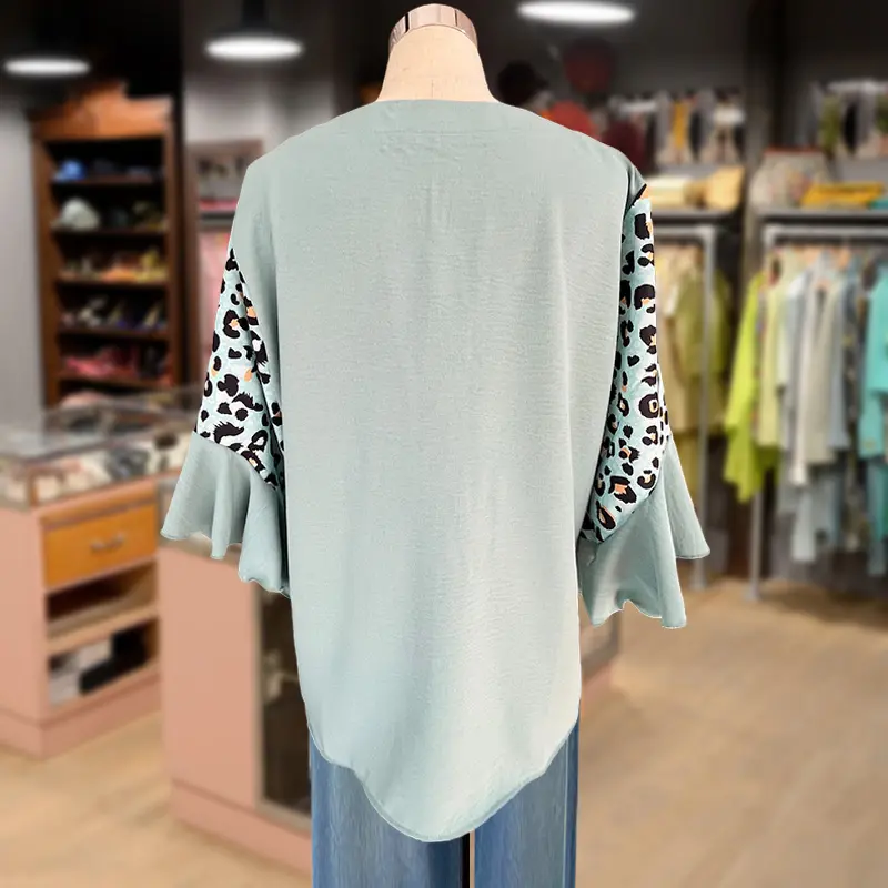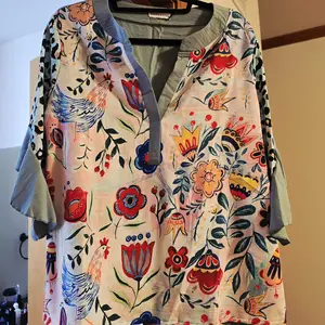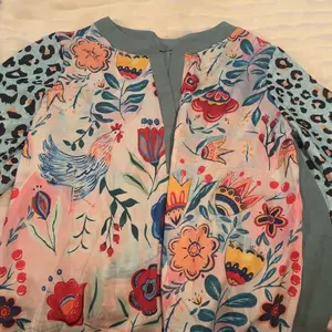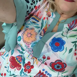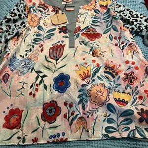 I love the happy colors of all the flowers and then the mismatched cheetah sleeves. They make me smile. The shirt is very well made. Has a silky feel and great stitching. I love the flouncy sleeves. I am 5'4-200 and a 38 double d/ triple d. The extra large that I ordered was too small so I'm in the process of getting the correct size.