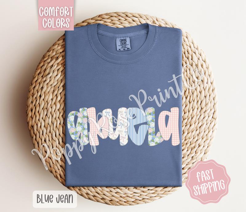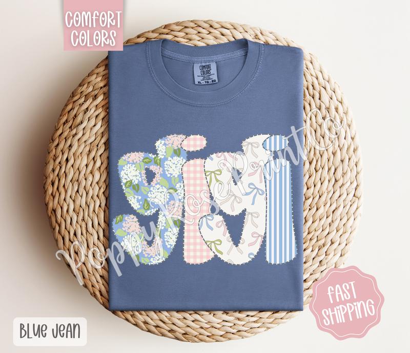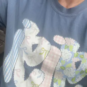 This is a perfect print on this comfort, color shirt. The design is amazing with the little hydrangeas, the flowers, the bows and the checker print along with some stripes love love love it.