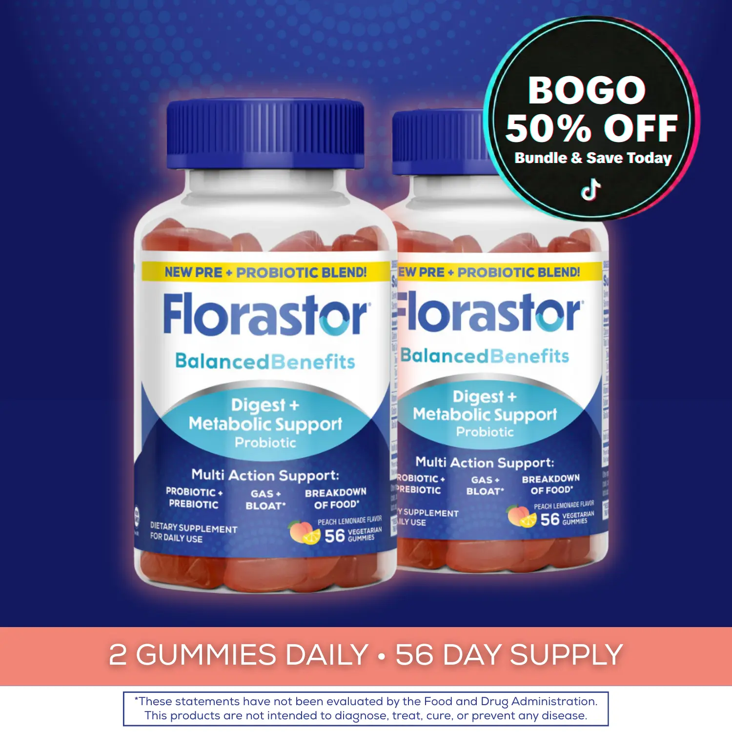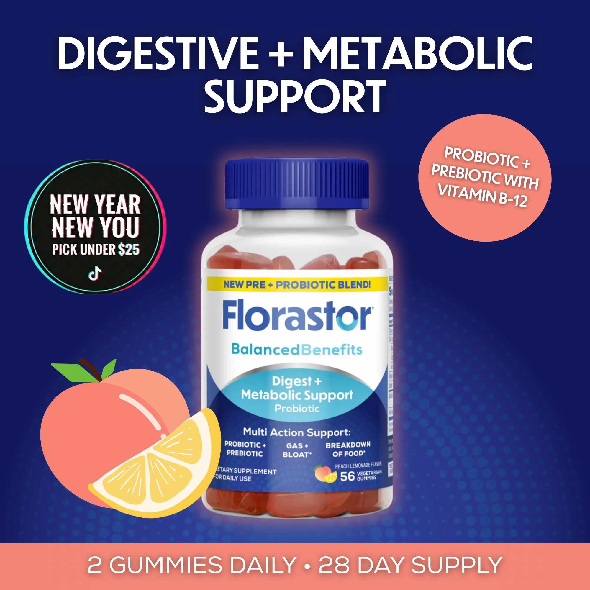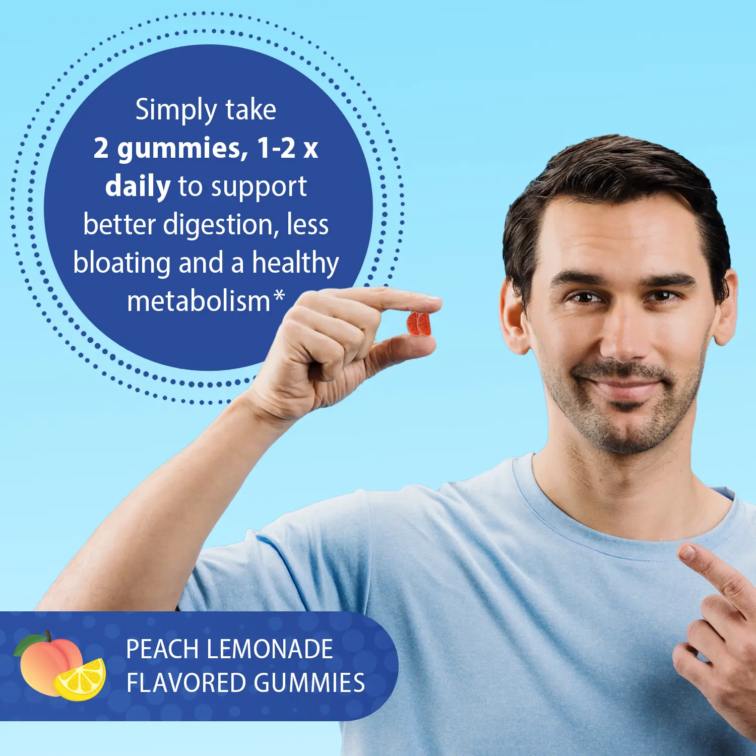Take two peach lemonade–flavored gummies 1–2 times daily to support digestion, metabolism, and less bloating—no pills or powders required.*