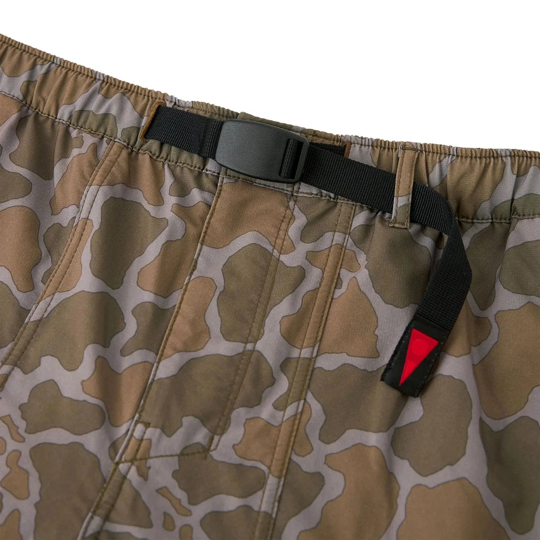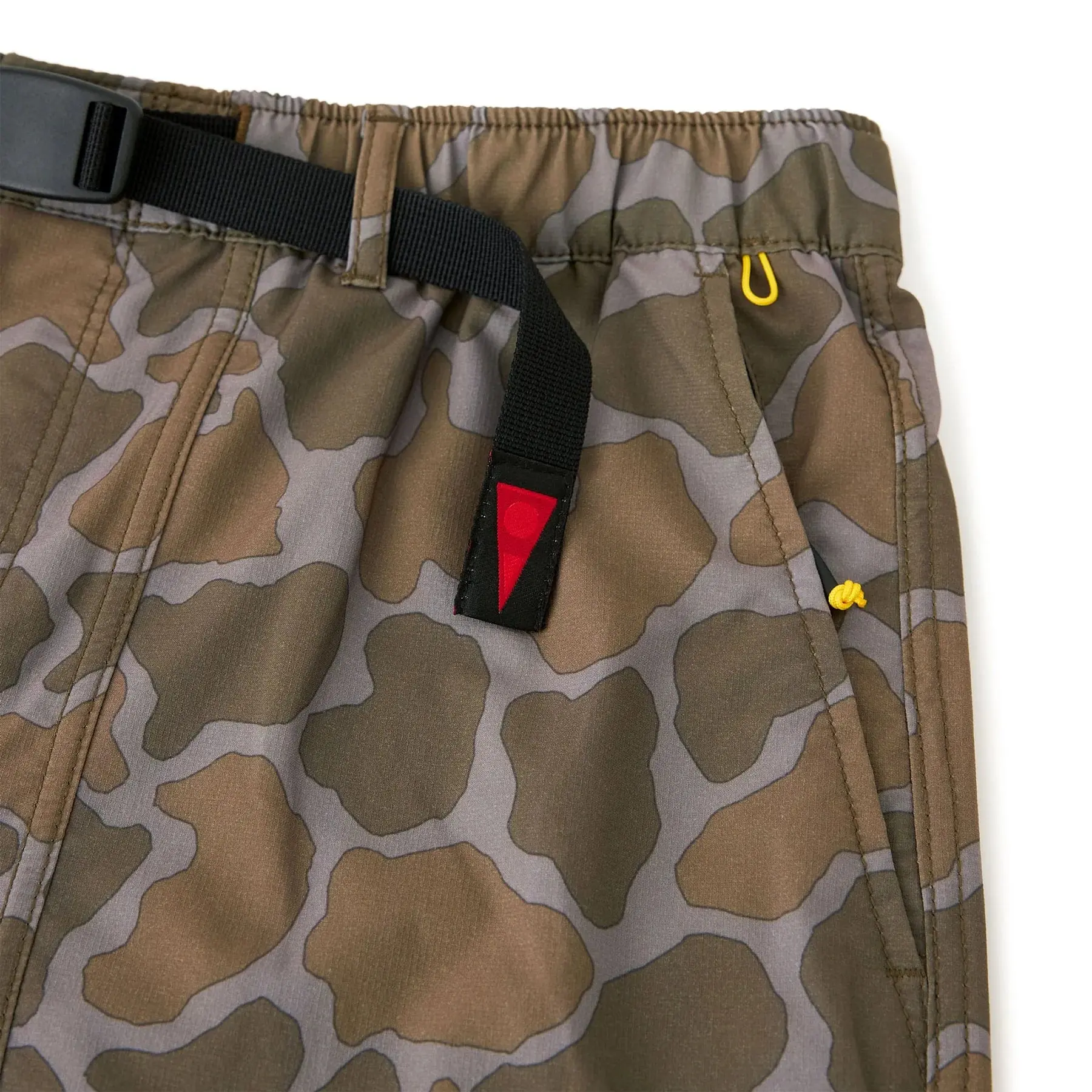 ·Integrated webbing belt secures the waistband capped with burgee branding.