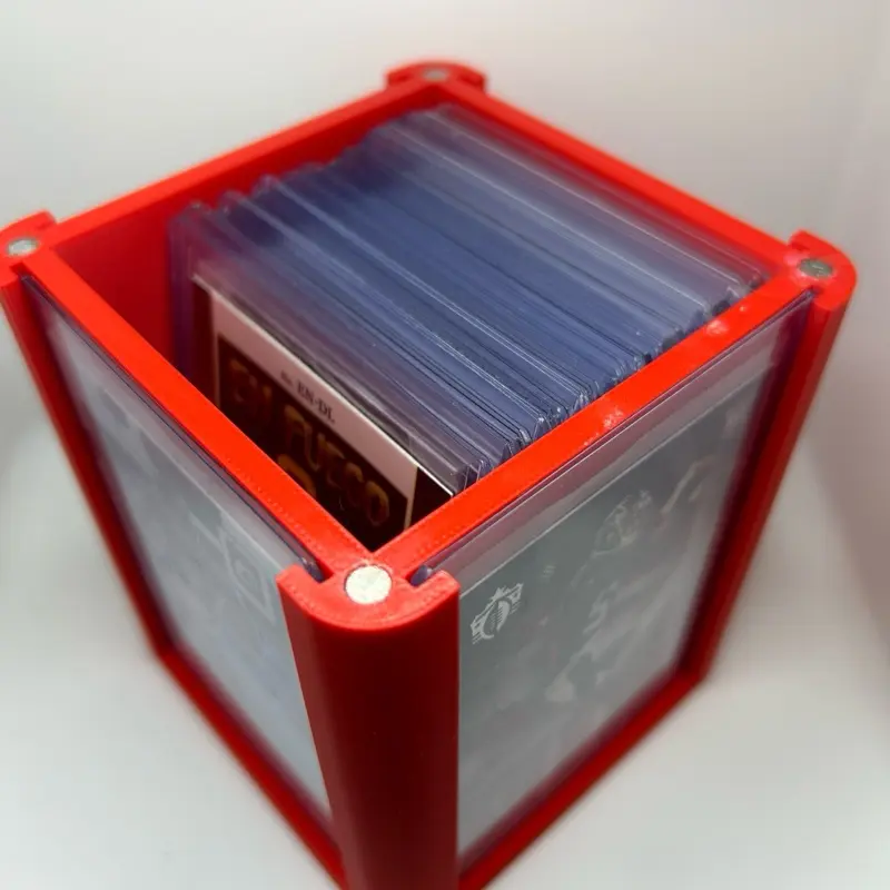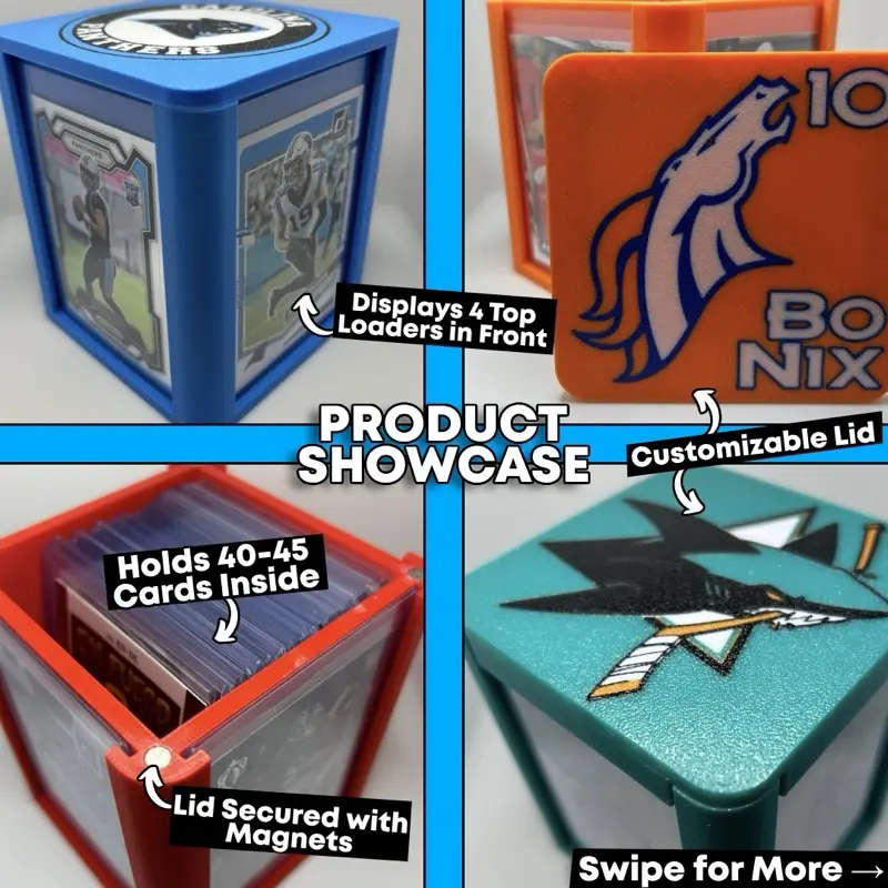 Organize and display your card collection in style with our custom 3D-printed card cube! This unique storage solution is designed to highlight your favorite cards while keeping the rest of your collection safe and secure. Personalize the lid with your favorite team, player, or design for a truly unique touch. These cubes display up to 4 cards on the outside while storing 40-45 cards inside the cube.