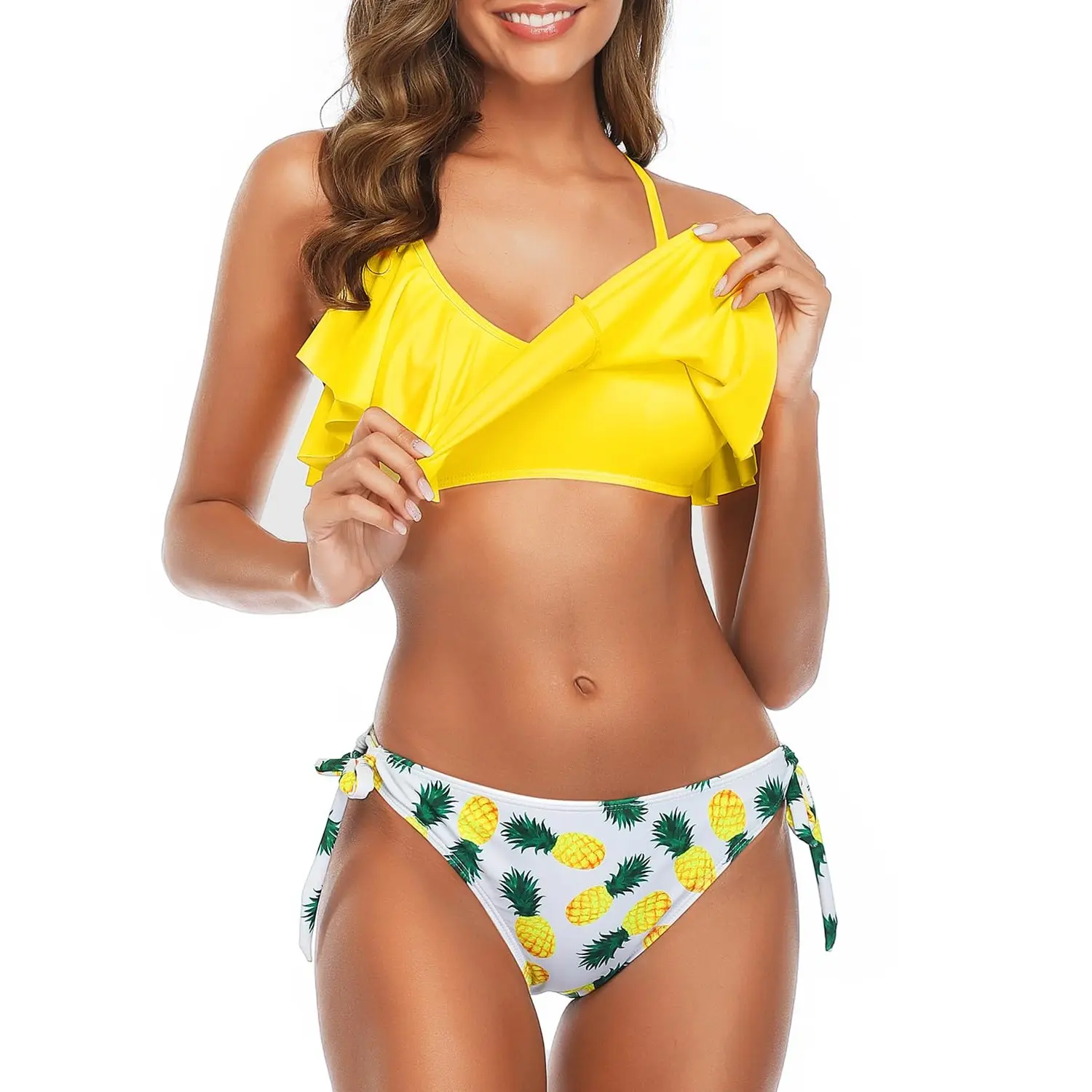 ·The two piece bikini has a high-cut bottom that is pretty cheeky and flattering. Two side ties offer an adjustable fit, and the tie-side briefs triangle add an adorable detail to your chic look. The top and bottom are fully lined and skin-friendly.