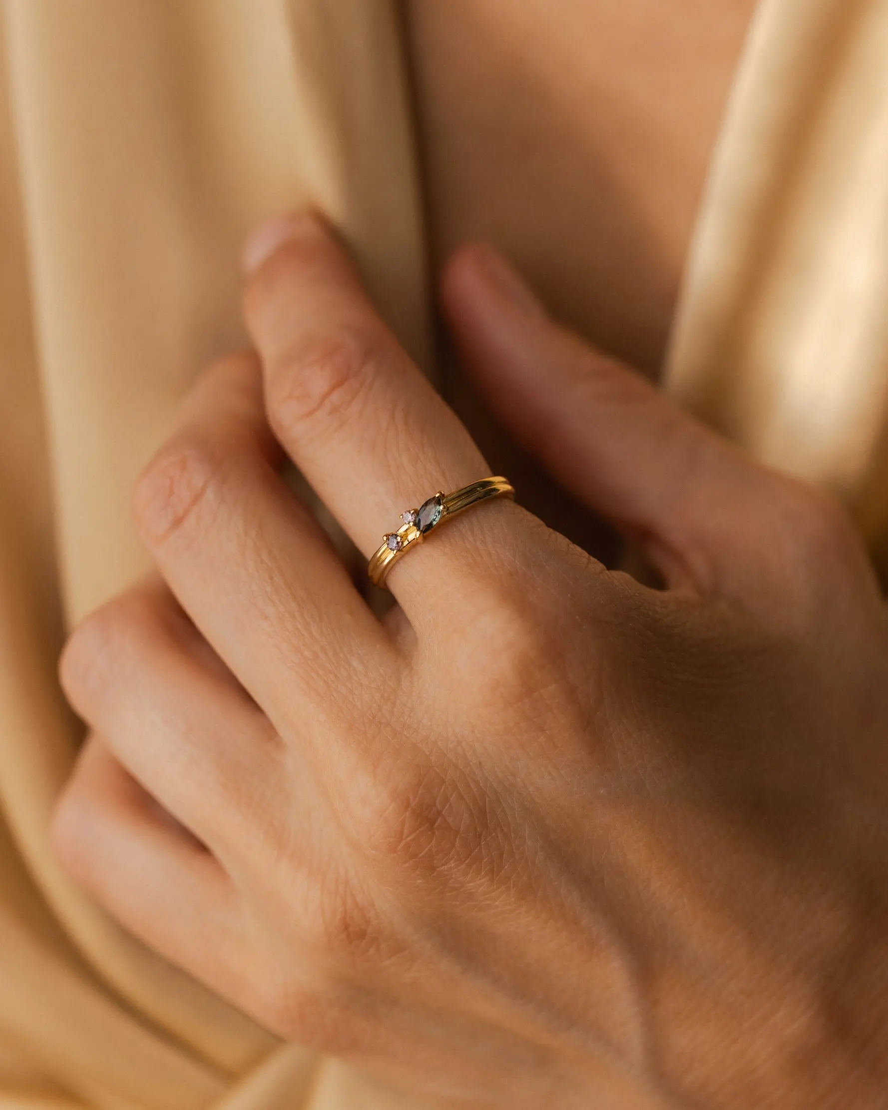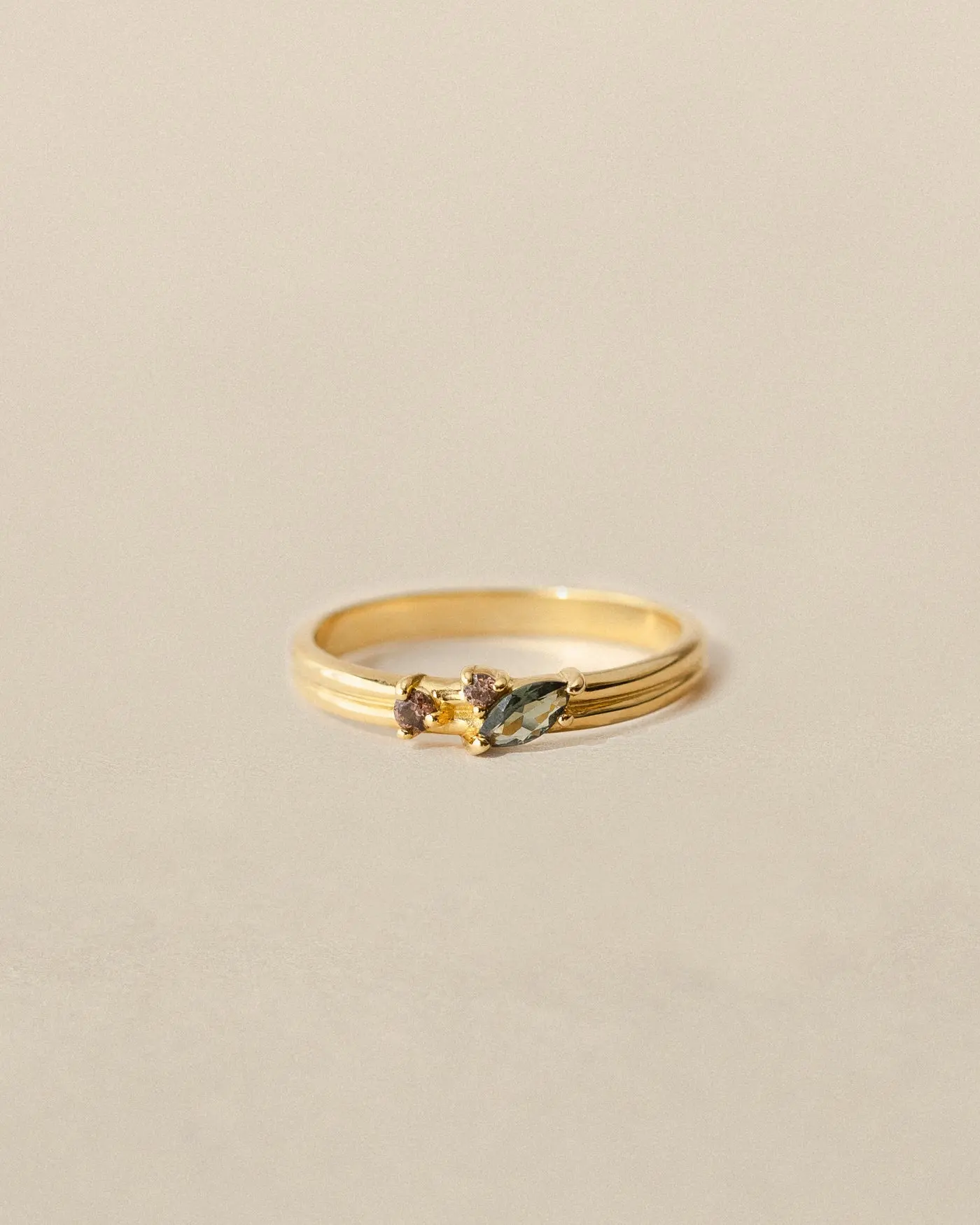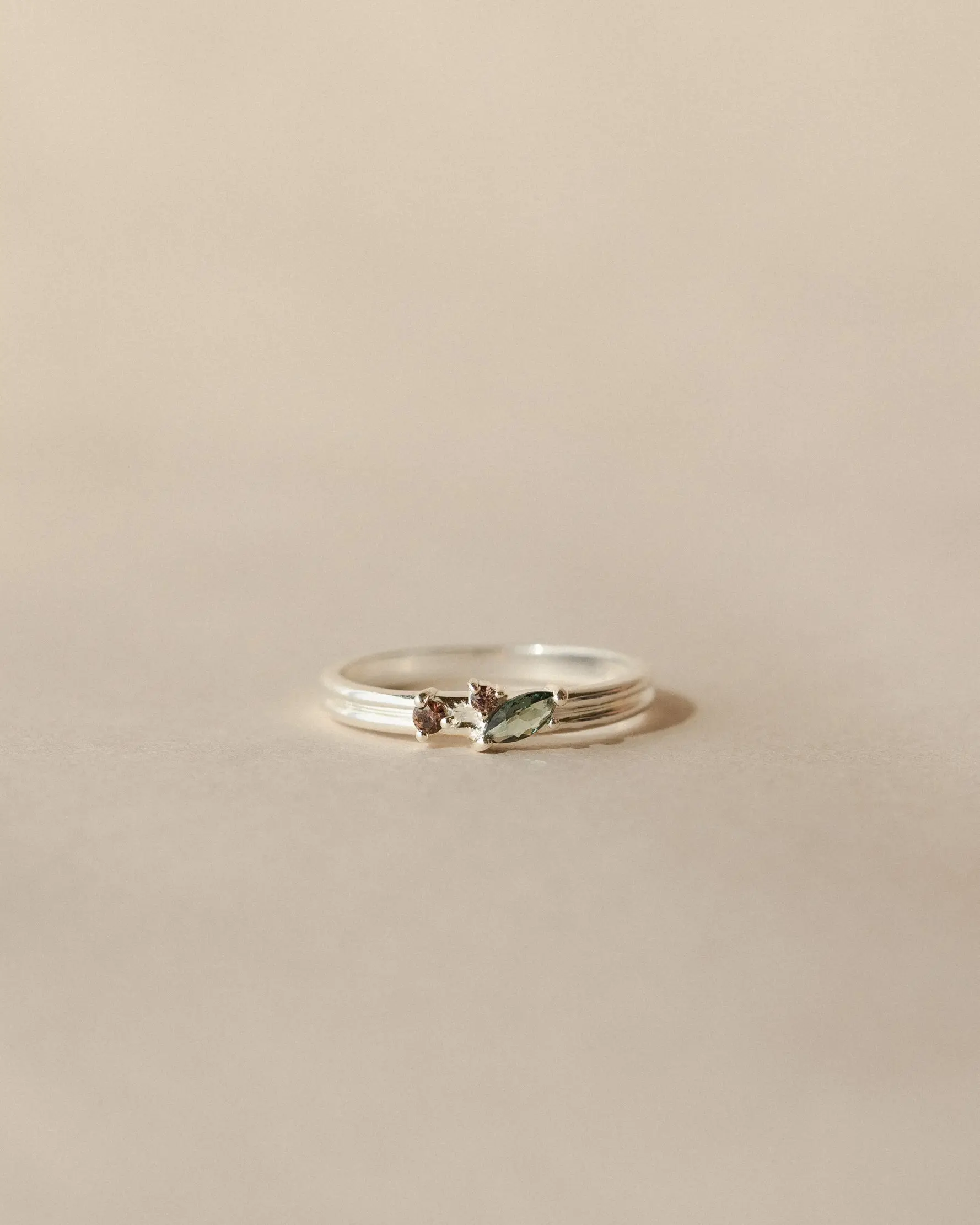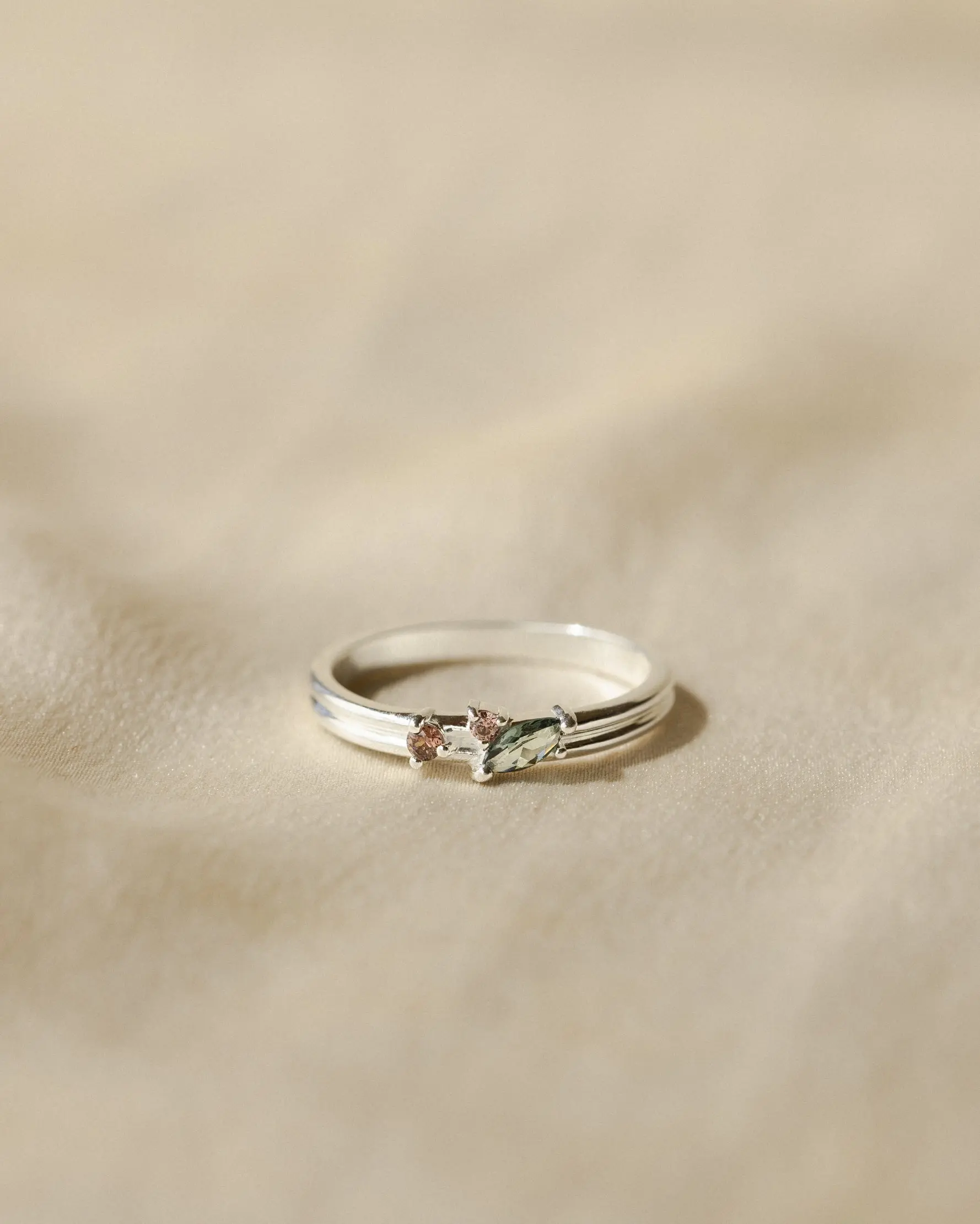 A lovely addition to stack with my other rings. The design is beautiful and the size is exactly right. I used the ring sizer tool and it was very accurate. I’m pleasantly surprised that the prongs that hold the gems don’t catch on my hair. The one thing is that the green stone looks grey because it’s such a pale color against my skin. I love how the band isn’t just a solid band and has detail. It makes it look like two rings put together.