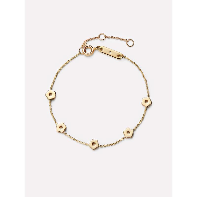 Discover a limited edition, contemporary twist on antique Chinese coins with our iconic squared cutout gold flower bracelet. Crafted with precision and style, this stationary bracelet radiates elegance without the need for additional adornments. Embrace the positive and chic vibe with this feminine gold chain bracelet, perfect for pairing with gold hoop earrings, a solid color V-neck blouse, and your favorite pair of straight jeans.