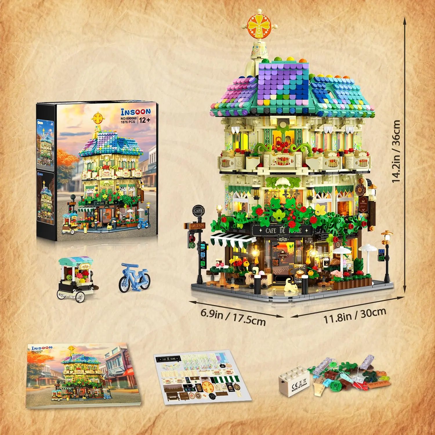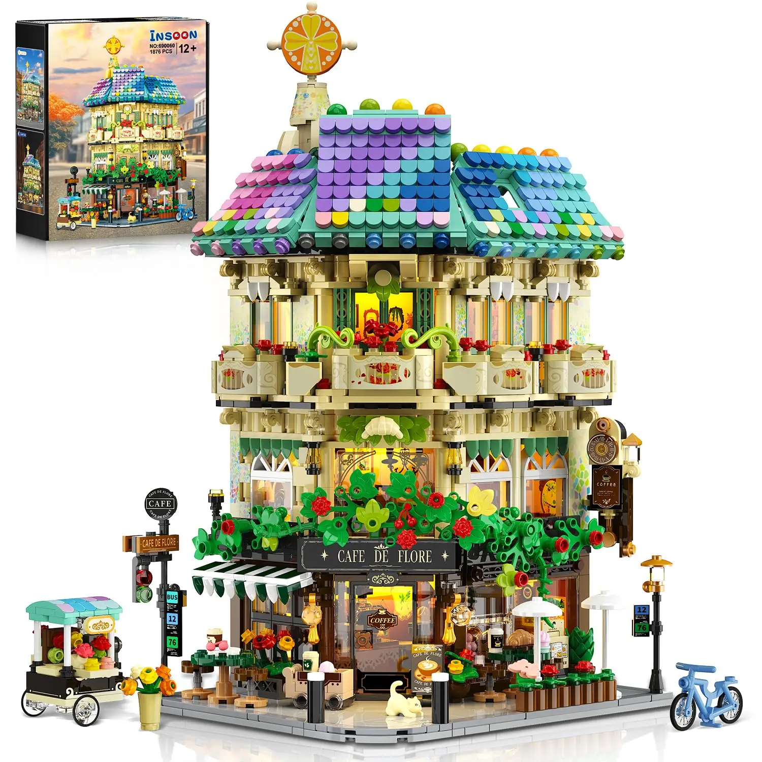 Experience the charm of everyday town life with this flower café shop building set, featuring a quick-release design for easy access and play, and packed with delightful details like a pastry counter, flower cart, and glowing LED lights on every level.