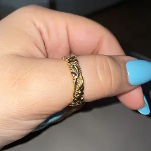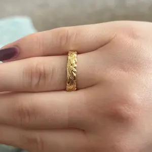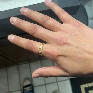 Love it hasn’t tarnish really cute I would say size up if you fingers are a bit chunkier