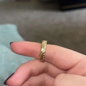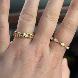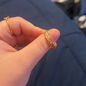 super cute little everyday ring. Probably today is day 4 or 3 of wearing it and still is shiny. hasn’t turned my finger green and i’ve worn it in the shower. color hasn’t scratched off . i accidentally ordered 2 but am wearing one ring at a time. just showing where i keep my ring and not green !