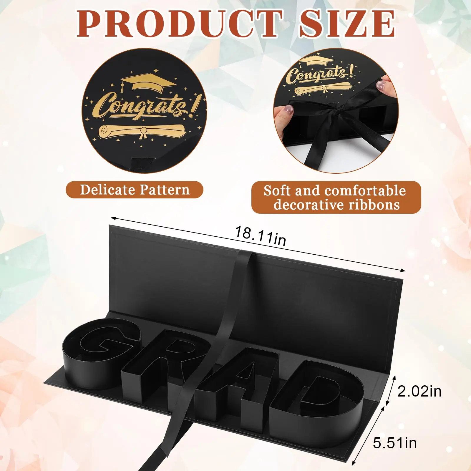 ·Quality Material and Size: Crafted from cardboard, this large 'GRAD' gift box ensures durability and sturdiness. Measuring about 18.11 x 5.51 x 2.05 inches, it is equipped to accommodate a variety of flowers and trinkets. It comes in two sublime colors, black and gold