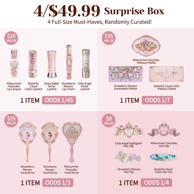 ·SET 4 Contains: Strawberry Rococo Hand Mirror (Random), Little Angel Highlighter L04 Moon River, and Swan Ballet Shine Lipstick (Random). Value: $75; Odds: 1/4.