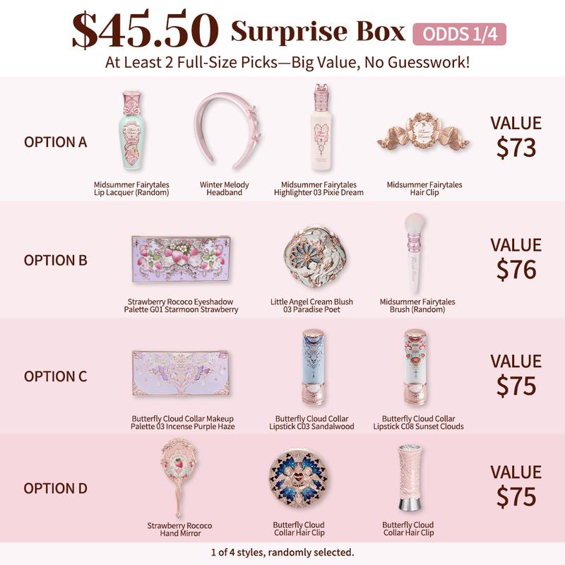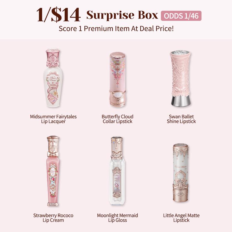 ·ONE Lipstick: Swan Ballet Shine Lipstick, Strawberry Rococo Cloud Lip Cream, Little Angel Matte Lipstick, Butterfly Cloud Collar Lipstick, Moonlight Mermaid Lip Gloss, or Midsummer Fairytales Coating Lip Lacquer. Value: $20; Odds: 1/46.