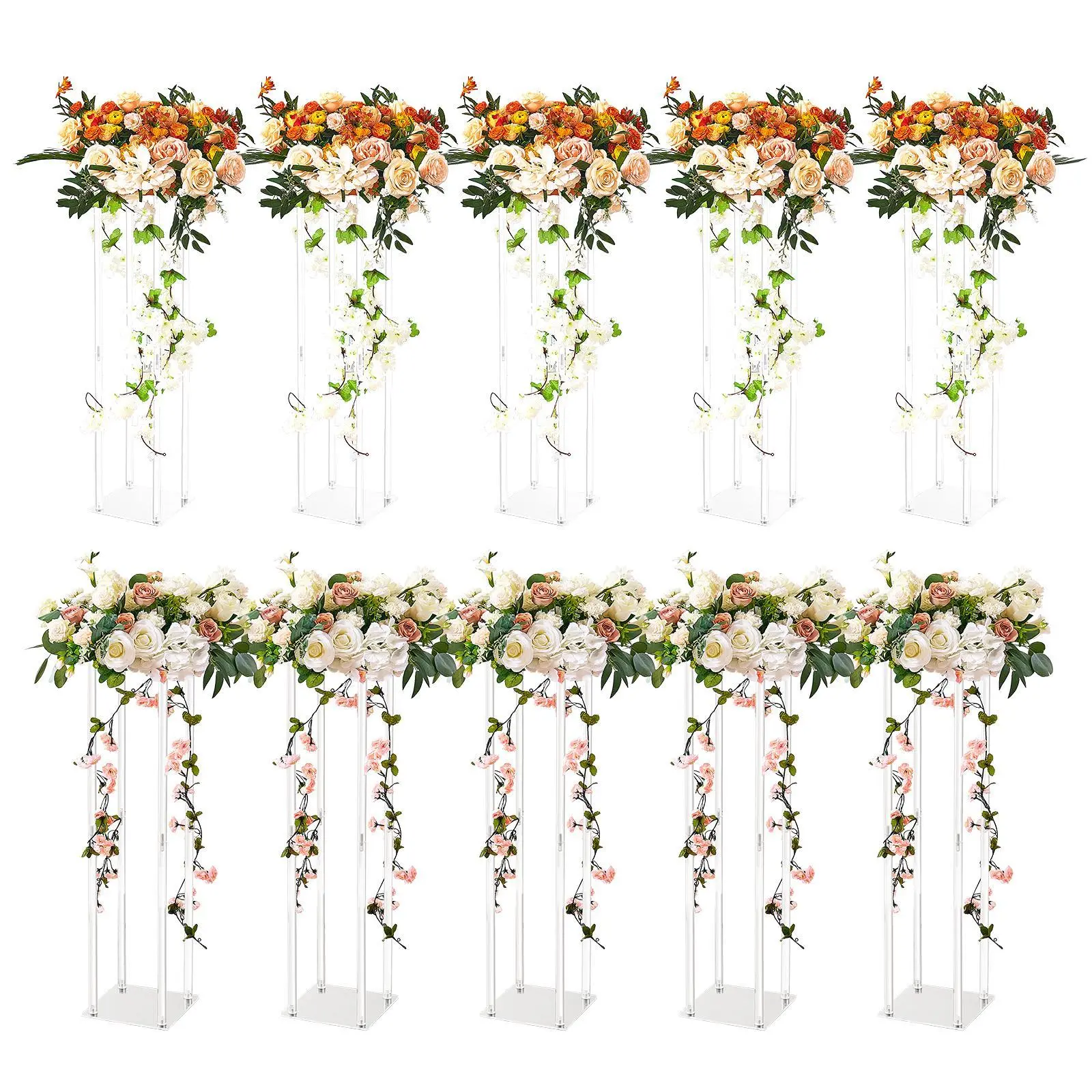• Easy Assembly: Assemble this wedding flower stand in just four easy steps: Install the square frames, assemble the acrylic round tubes, connect the top and bottom frames to the columns, and place the acrylic layer boards on top and bottom. No tools needed, and it only takes a few minutes.